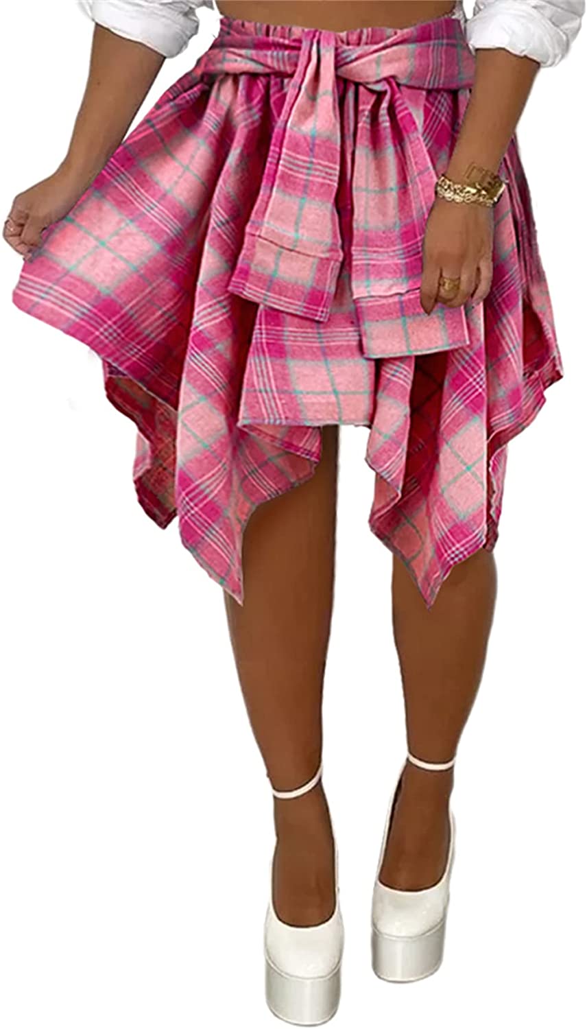 Features: 90s vibes plaid pattern, grunge pleated design, irregular hem, flared A-line shape, and elastic waist, shirt-sleeve-style ties design, just like tying plaid overshirts around our waist.