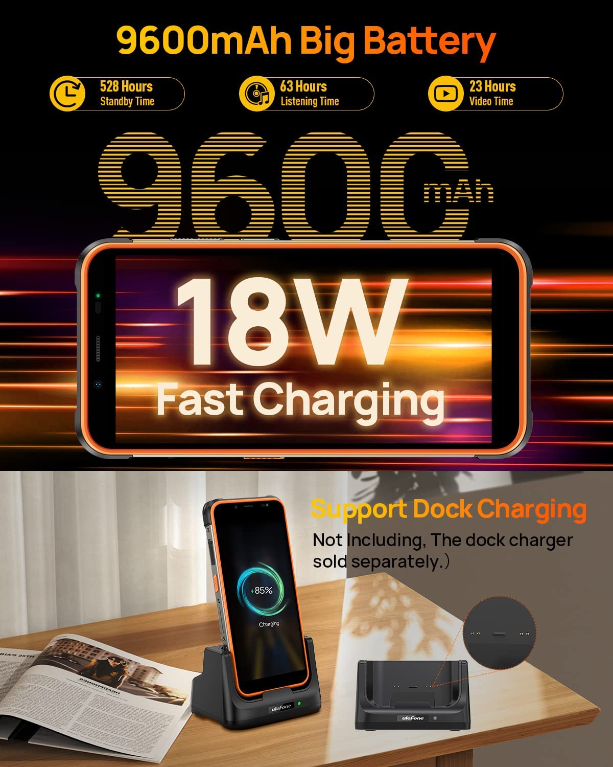 • ?【9600mAh Battery 18W Fast charging】: Comes with a 9600mAh massive battery and 18W fast charging. With OTG cable, Armor 16 Pro Rugged Mobile Phone with power bank function.You can charge most smartphones or tablets. Support Dock Charging! (The dock charger sold separately)