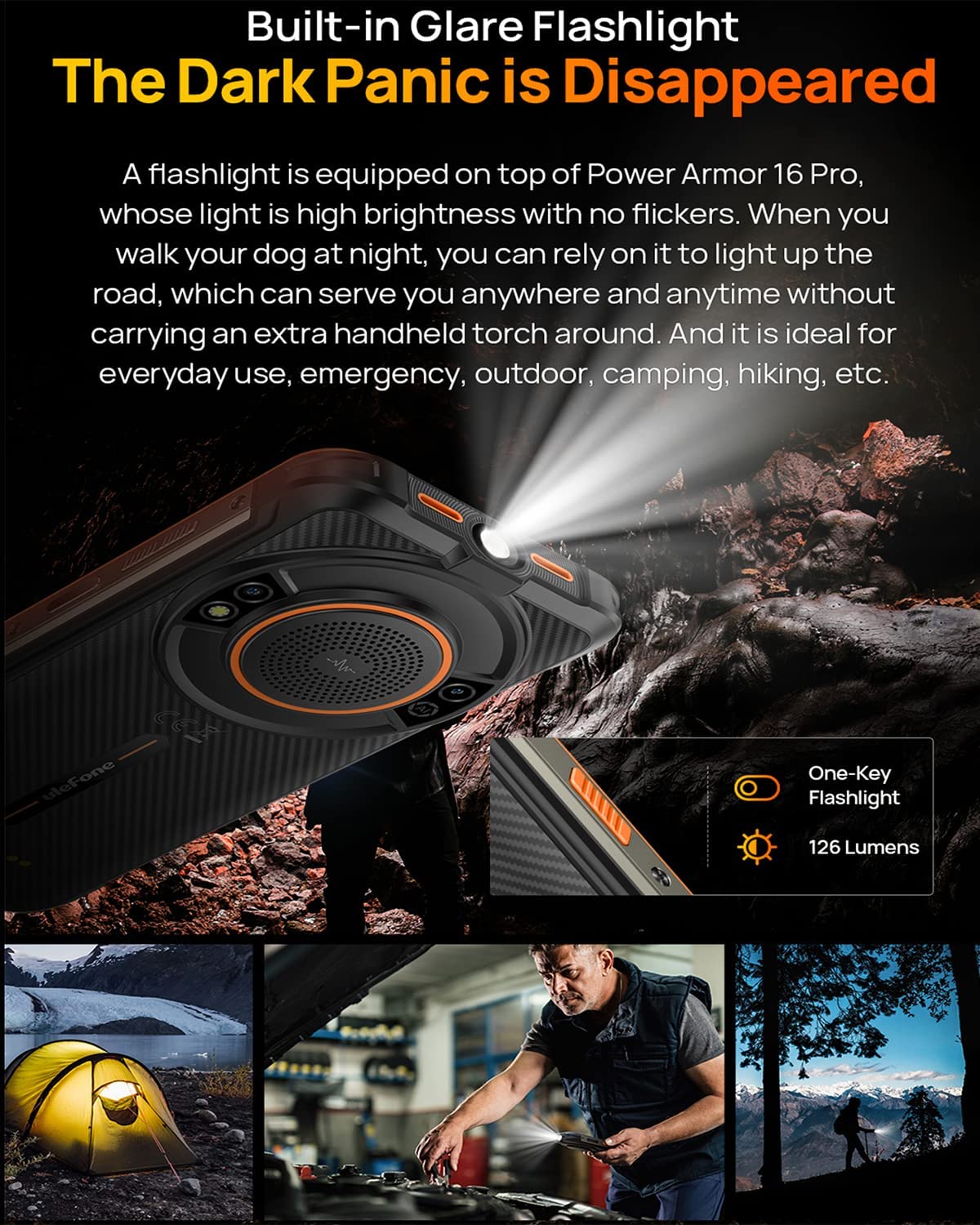 • ?【Built-in Glare Flashlight Outdoor Rugged Phone】 A flashlight is equipped on top of Power Armor 16 Pro, whose light is high brightness with no flickers. When you walk your dog at night, you can rely on it to light up the road, which can serve you anywhere and anytime without carrying an extra handheld torch around. And it is ideal for everyday use, emergency, outdoor, camping, hiking, etc.