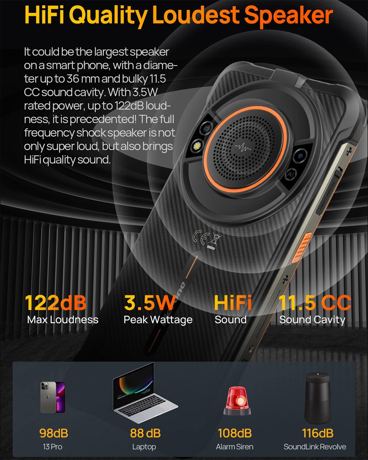 • ?【122dB Bass Speaker & Support Endoscope】: Buy the Ulefone Power Armor 16 Pro get a super shock Speaker. With 3.5W 122dB loudness, speaker is not only super loud, but also brings HiFi quality sound. Supported uSmart Expansion Connector, compatible with Ulefone endoscopes, microscopes and other equipment. (The Expansion devices sold separately.)