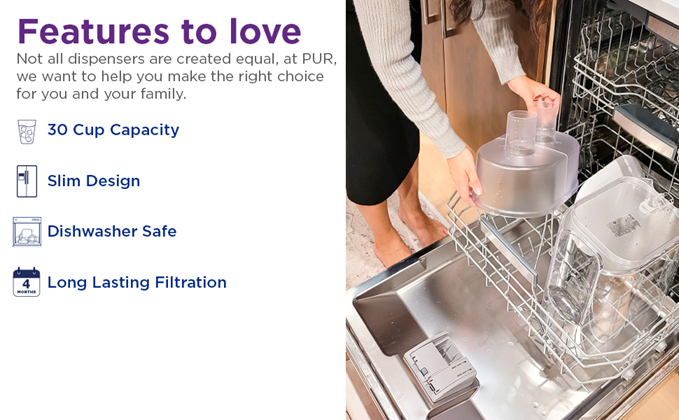 While home tap water may look clean, contaminants can get into your water through household plumbing. The PUR 44-Cup Filtered Water Dispenser offers refreshing water, quickly and easily. It’s an extra-large capacity water filter dispenser that holds up to 2.75 gallons – the largest capacity dispenser available! It includes 2 filters to last twice as long and filter twice as fast and a filter change light for replacement reminders. The elevated, space-efficient design is ideal for placing on the kitchen counter for everyday use and entertaining. Plus, the removable stand features filter storage for up to 6 extra PUR filters. PUR’s superior filter technology uses activated carbon and ion exchange media and is certified to reduce 2x more contaminants than Brita's leading pitcher filter.*ƚ Each PUR water filter is certified to reduce Mercury and certain Industrial Pollutants as well as reducing chlorine (taste and odor) and more.ƚ Using a PUR water filter system can save up to $1,000 per year on average compared with the cost of bottled water** and help keep plastic bottle waste out of landfills. Each filter is certified for up to 40 gallons. Replace your filters less often than with a single-filter system. Replace every 4 months when the filter change light turns red. Generic and private filters are not tested or certified for use in PUR filters. Genuine PUR filters are the only filters certified to reduce contaminants when used with PUR systems.ƚ Disclaimers: ƚ PUR does not filter microbes *Versus best-selling Brita® pitcher filter OB03. Brita® is a trademark of Brita LP. **Based on comparing a year's worth of bottled water (16.9 oz) to a PUR Dispenser a year's worth of 9 refills. Based on Nielsen US Scantrack sales.