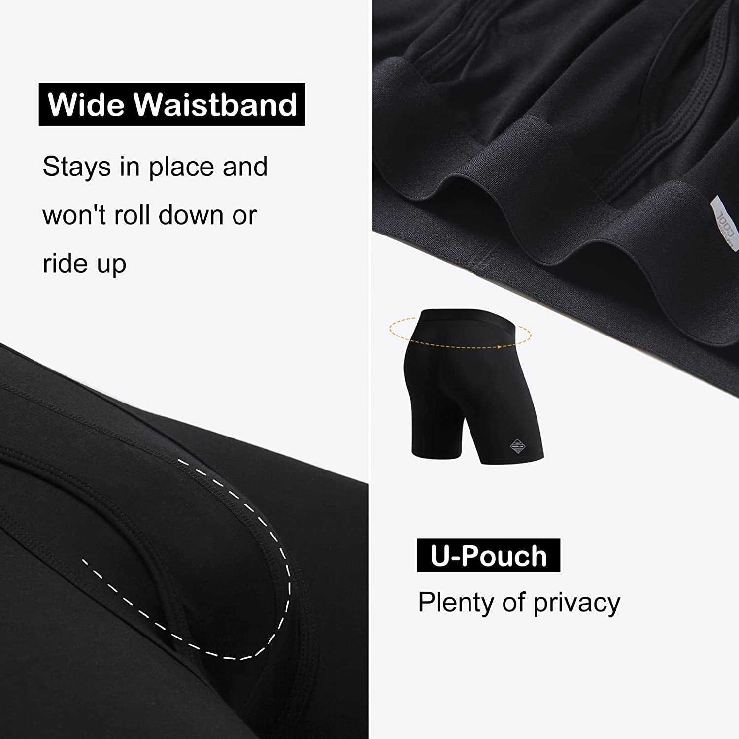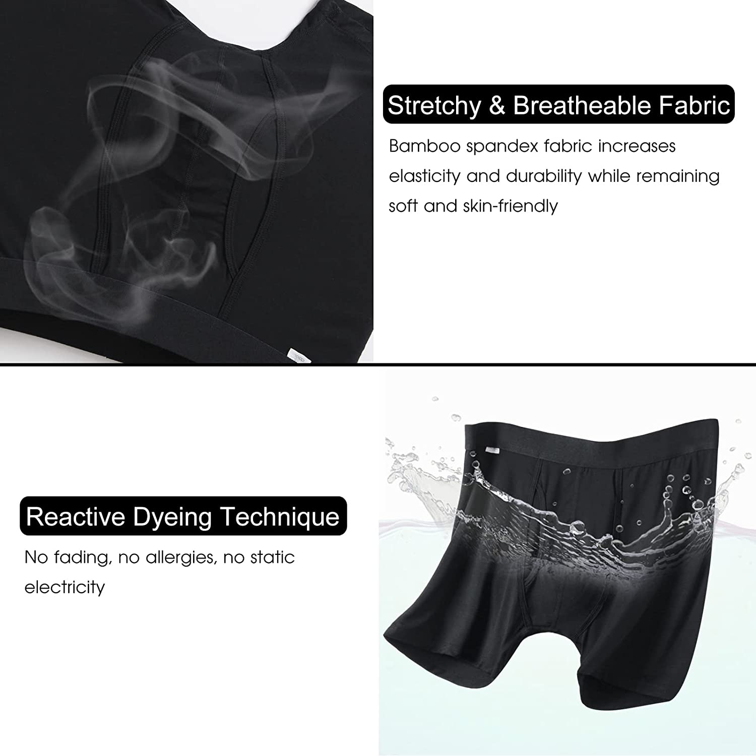 • 【NO-RIDE-UP】: This fabric is Bamboo Viscose & Spandex, which is a lightweight, breathable, stretchy pair that won't fade or shrink fabric. Bamboo fabric has a natural moisture absorption and perspiration functionThe design of lengthen the leg will more securely wrap the important parts of men, and effectively reduce the friction between the legs.