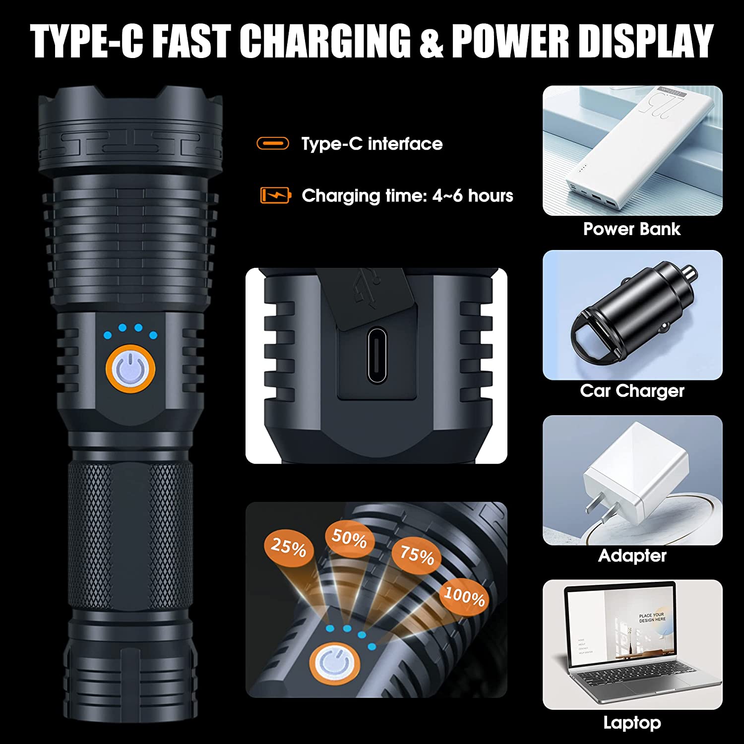 ?【LOW BATTERY DISPLAY & TYPE-C FAST CHARGING】?MT100 high lumens tactical flashlight has a power display function. The power indicator light above the handheld flashlight can help you clearly understand the battery usage (100%, 75%, 50%, 25%). With the Type-C fast charging interface, you can use the USB charging cable (included) to connect to an AC charger, car charger, mobile power bank or computer to charge the high-power flashlight.
