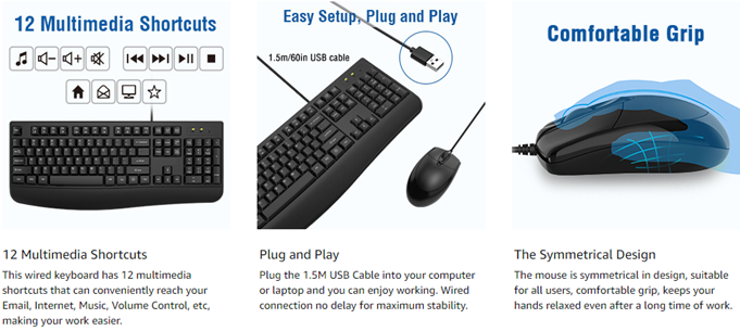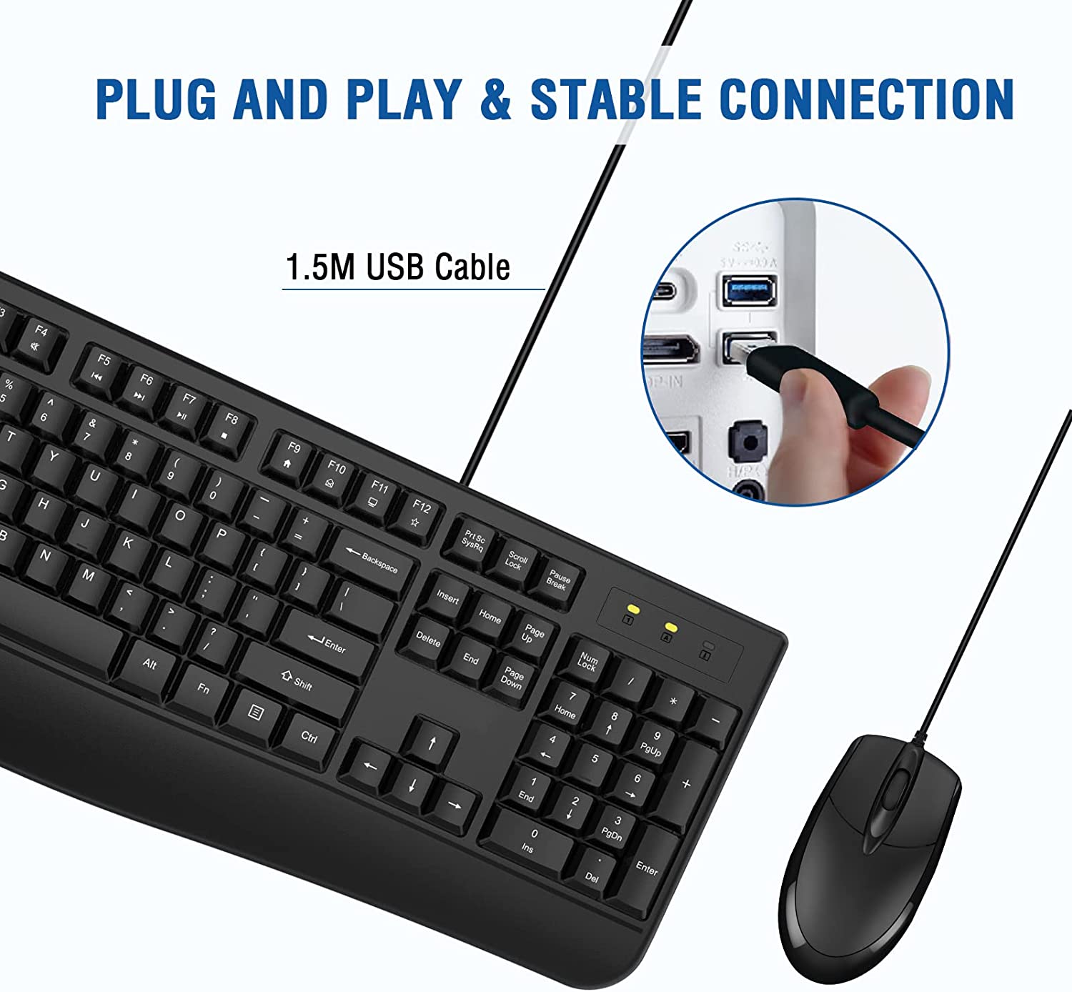 • 【PLUG & PLAY AND STABLE CONNECTION】This wired keyboard mouse combo is plug and play, no needed install any drivers, wired connection can provide more stable signal input than wireless connection, more responsive typing.