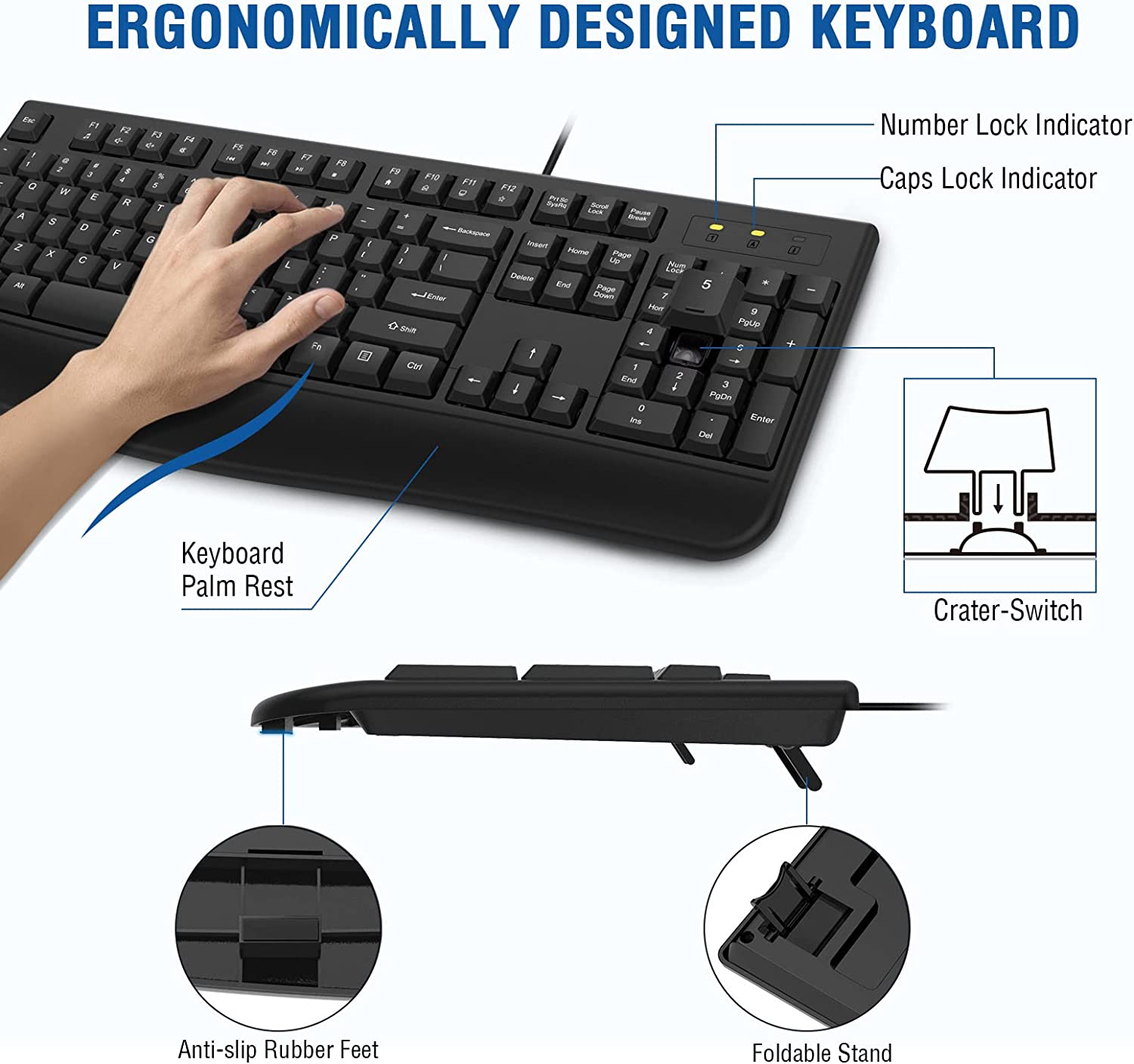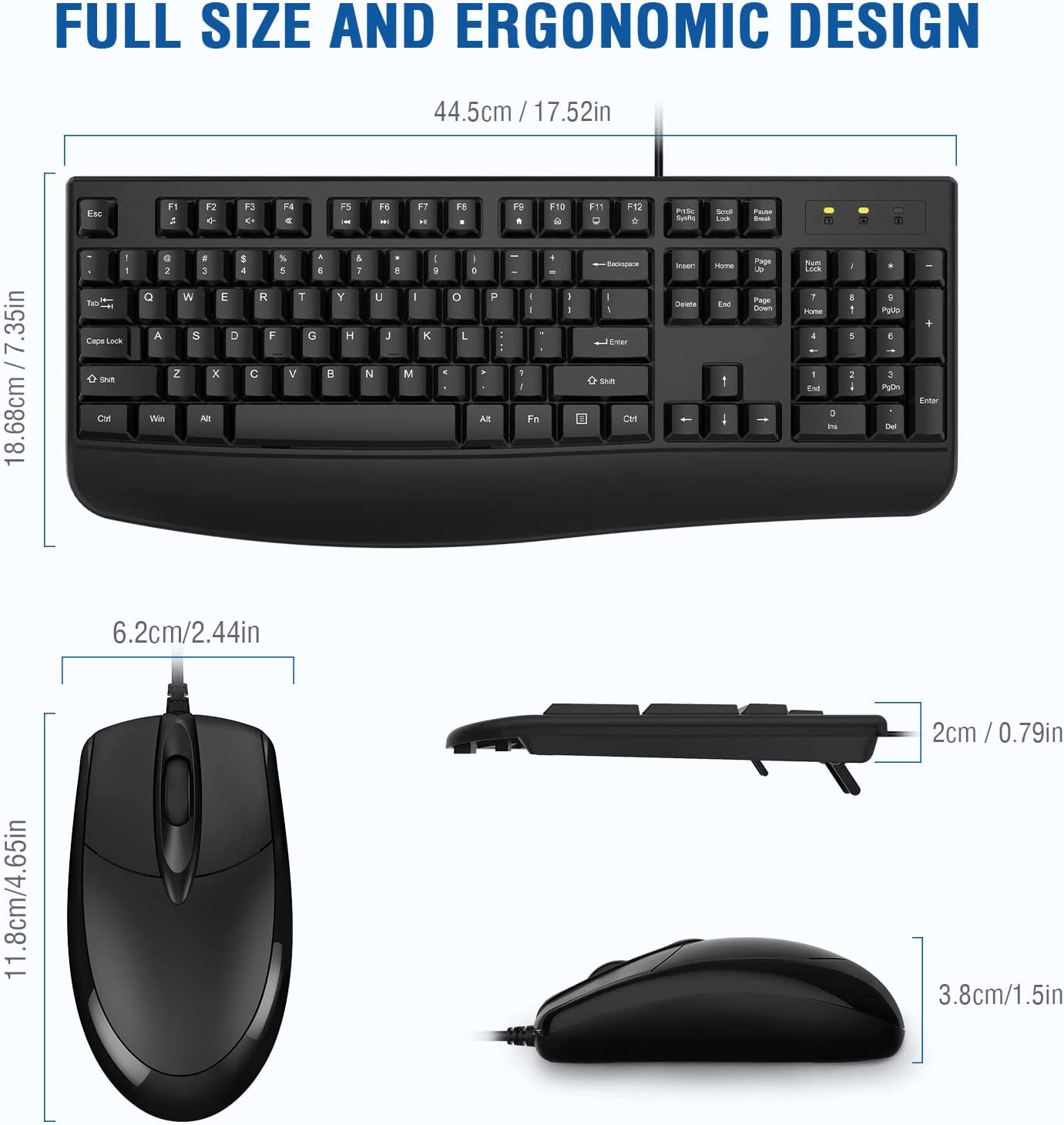 Wired Keyboard and Mouse Combo, EDJO Full-Sized Ergonomic Computer Keyboard with Palm Rest and Optical Wired Mouse for Windows, Mac OS Desktop/Laptop/PC
