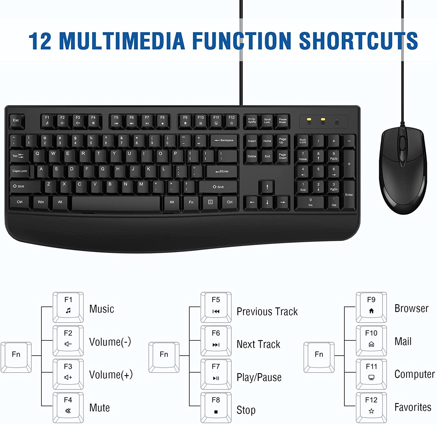 • 【12 MULTIMEDIA SHORTCUTS】The wired keyboard has 12 multimedia shortcuts combinations that is convenient to instant access music, volume, computer, mail, etc. it can improve work efficiency greatly. There are caps lock Indicator and number lock Indicator In the upper right corner of the keyboard. (Note: Some multimedia function are not available with Mac OS)