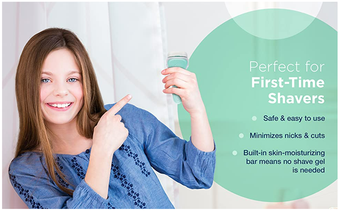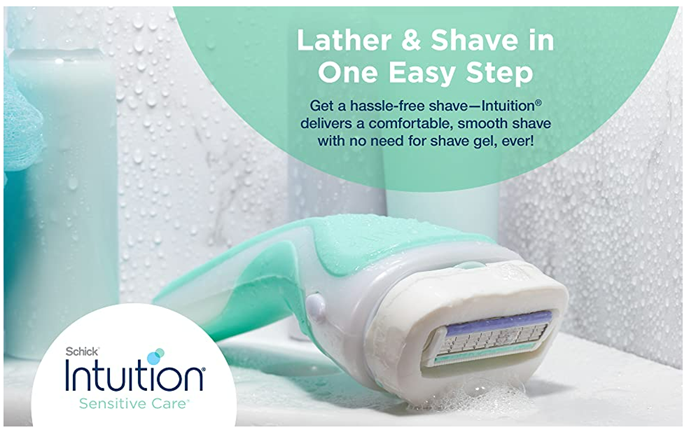 The Schick Intuition Sensitive Care women’s razor lathers and shaves in one easy step, with no need for shave gel! Our sensitive skin razor features a built-in moisturizing bar made with natural fragrances and organic aloe. The gentle Sensitive Care formula is dermatologist tested, vegan and hypoallergenic, making it great for sensitive skin. Intuition’s smooth-gliding 4-blade cartridge has a pivoting head to hug the contours of your legs and body. A stand-up cap is included for easy shower storage. Plus, the Schick Intuition Razor is perfect for first-time shavers, minimizing nicks and cuts.