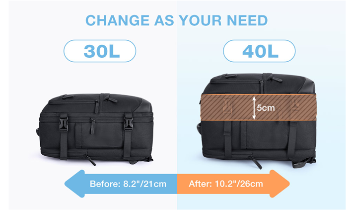 UPGRADE ITERATION: Expandable design added for the first time, with 25L-40L of travel backpack storage space to change as you wish, the maximum capacity can store 3-5 days of clothes. Of course, it does not stop there, the backpack also has a built-in elastic band, which can be compressed clothing, prevent clothes from falling, maximize the use of the backpack storage space, saving an additional 10% of capacity.
