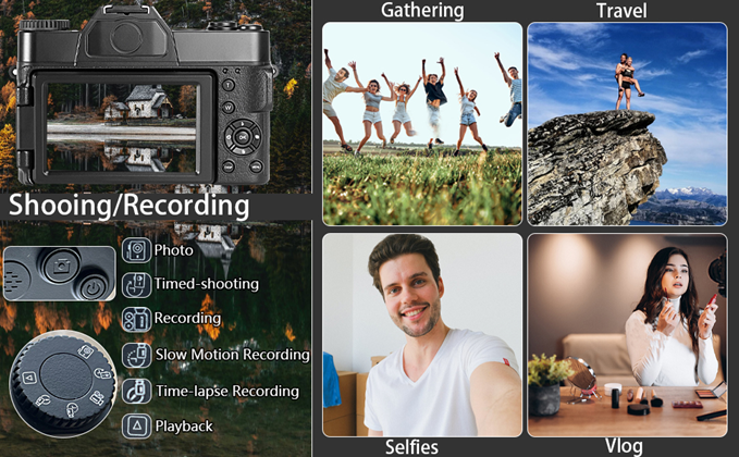 • ?Perfect Gift?: This point and shoot camera with compact size(0.57LB, 4.3*2.96*1.2 INCH) is so lightweight and portable. Pefect for amateurs and beginner photographers to take it around(NOTE: Not professional cameras). Easy to use makes it an ideal camera gift for beginners, kids, teens, students, elderly to take pictures and record, a perfect Christmas or birthday gifts for all ages, a perfect vlog camera for festivals, sports events, weddings or parties.