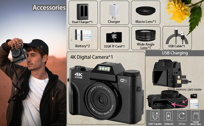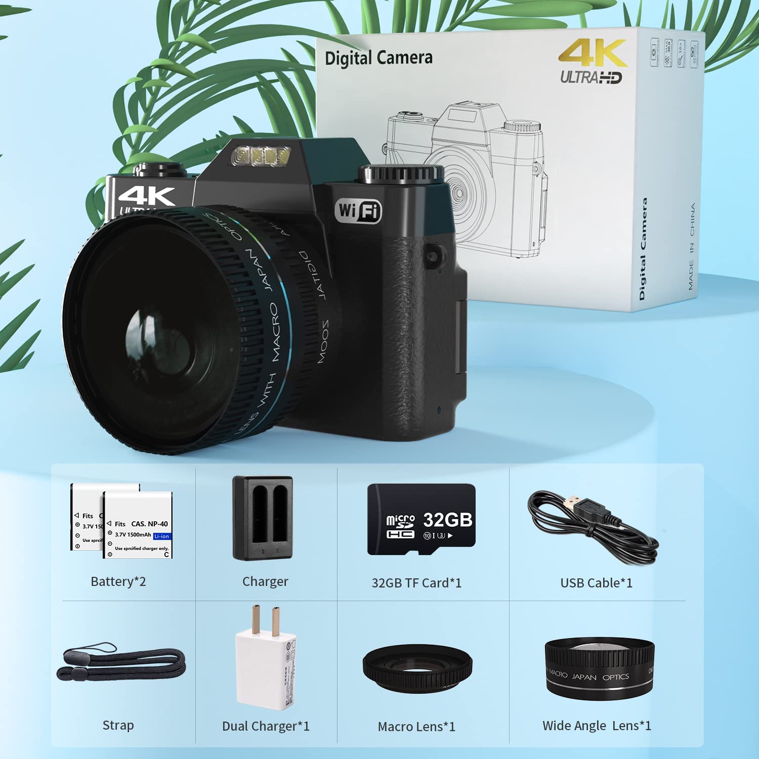 • ?Digital Camera for Photography ?: The 4k small digital camera with 30fps video resolution and 48 megapixel, provides a smooth shooting experience than 2.7K or 1080P video cameras, which can capture every excellent moment while vlog recording, the best camera for youtube. Equipped with wide angle & macro lenses and supports 16X Digital Zoom to get closer focus from far away and take close-up with clear details photos or recorder a wider range of scenery.