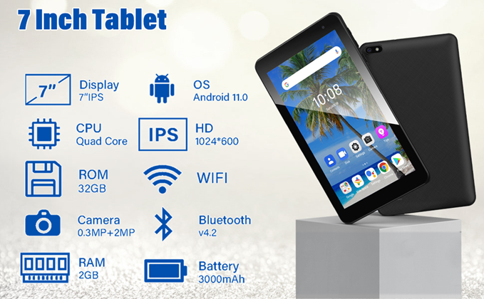 - 【Android 11, 128GB of Expandable】 7 inch tablet use the latest Android 11.0 OS, 2GB+32GB, Can be expanded up to 128GB via TF card, ensures you have an ultra-smooth gaming and speedy multimedia using experience, delivering quick app launches