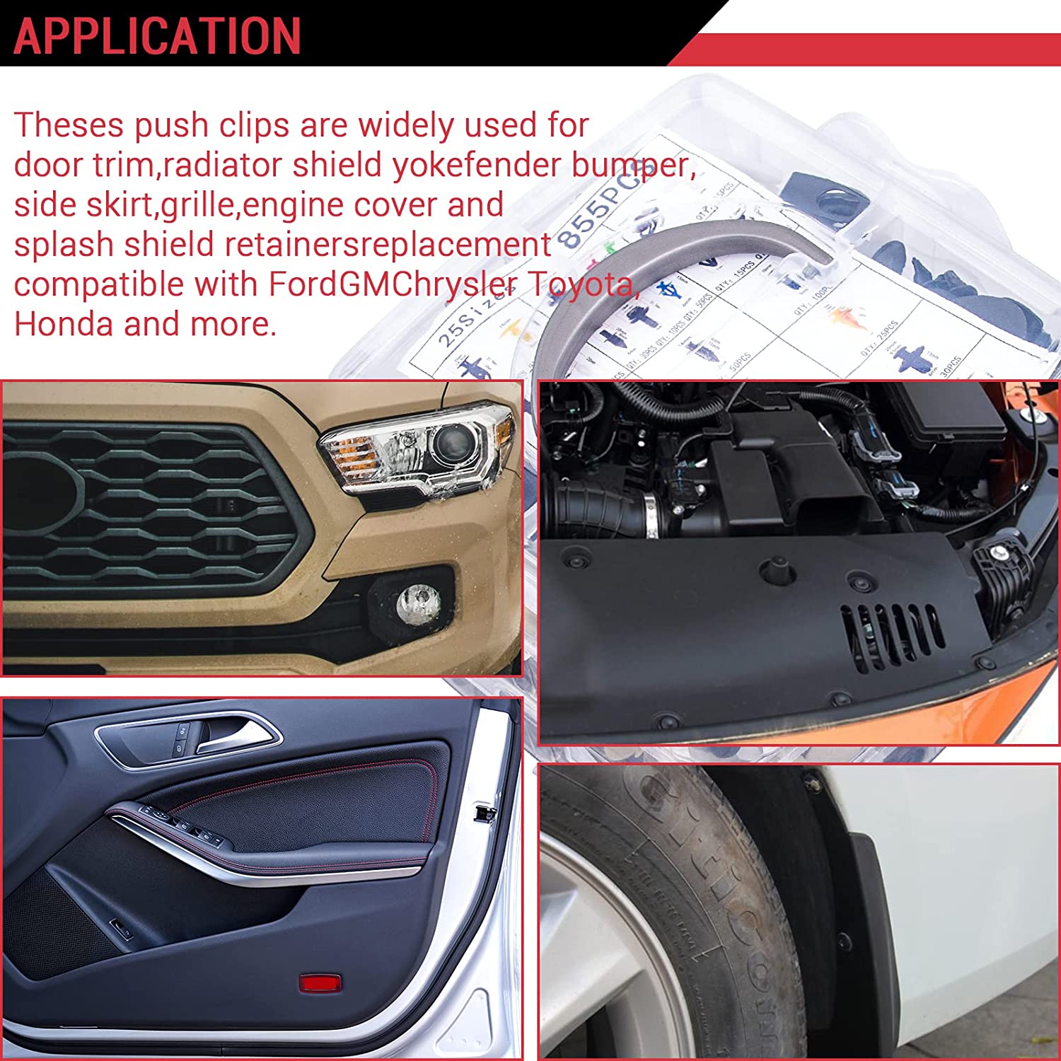 【Widely Application】 -Theses push clips are widely used for trim plate clamps, door trim clamps, door clamps, bumper clamps, fender clamps, hood and splash guard fastener replacements. It always covers a number of applications, including telecommunications equipment, motor vehicles, household appliances, furniture and electrical equipment.