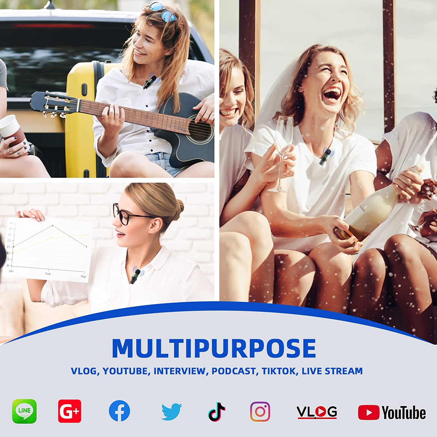 Easy Auto Connect: Plug & Play, no Bluetooth, no app to install! Just plug the receiver into your device, turn on the lapel microphone switch, and the device will automatically complete the pairing after the indicator light stays green. Dual microphones, double the working time. Two packs microphone allows two people to participate in video recording together, providing efficiency and convenience for team workers. Mini mic for Vlogs, live stream, blogs, podcasts, YouTube, recordings