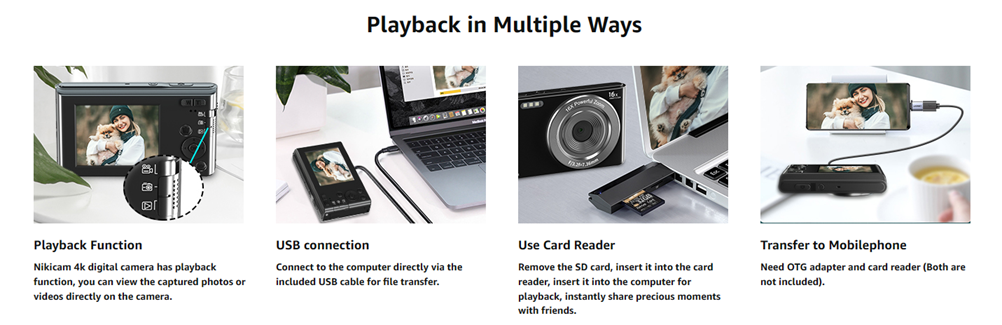 - 【Point and Shoot Camera with Webcam Function】NIKICAM vlogging camera for youtube can be used as a computer camera. Turn off the camera first, connect the camera to the computer with a USB cable, choosing the "Camera mode", you can have a video calls with your friends and family or livestreaming on tiktok youtube. The external 1/4 standard size tripod interface can be installed with a tripod to help you stabilize shooting or recording on your vlog.