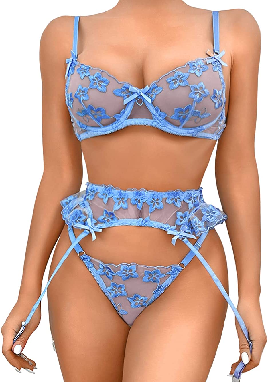 ✿Style: This underwire ruffle lingerie set with flower embroidered lace overlay and satin bow decor can enhance femininity and outline sexy breast lines.