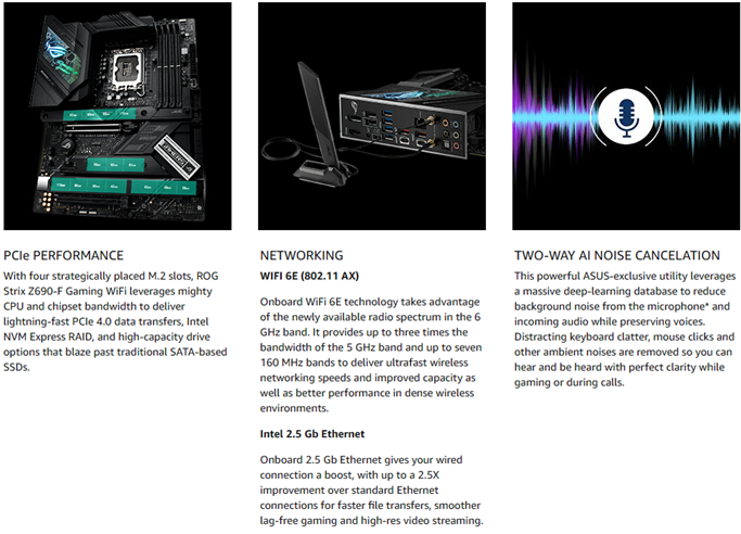 • AI Motherboard : AI Overclocking, AI cooling, AI networking(GameFirst VI) and AI noise cancellation