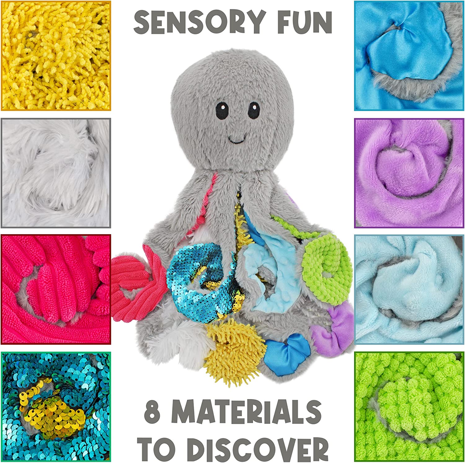 • UNIQUE SENSORY EXPERIENCE: Quiggly the Octopus stuffed animal weighs 1 lb. and provides your child with a unique sensory experience. Each of the Octopus tentacles have a different sensory material for your child to discover.