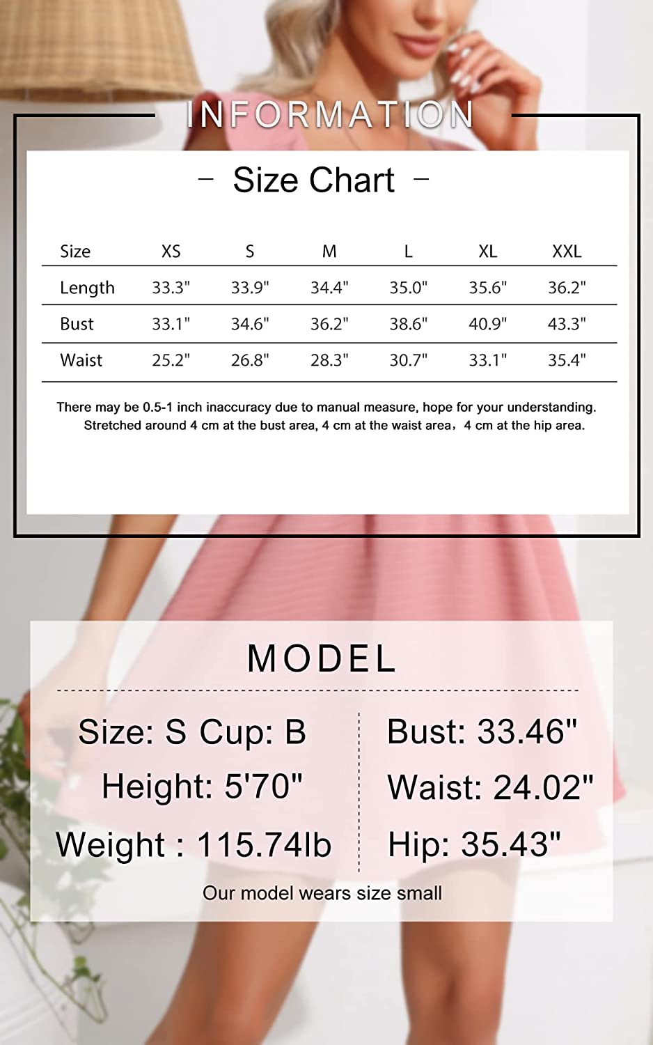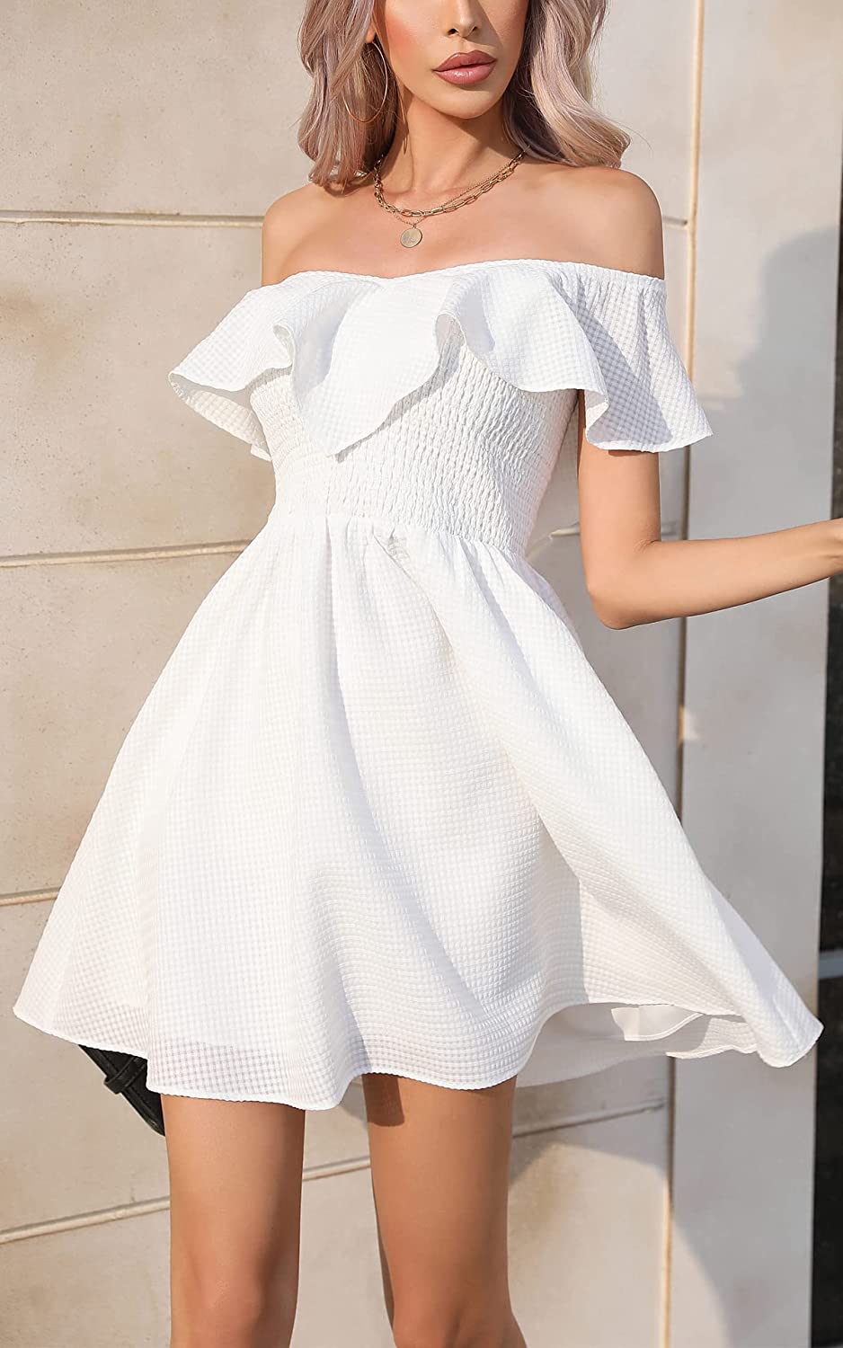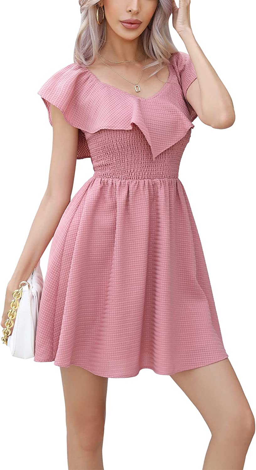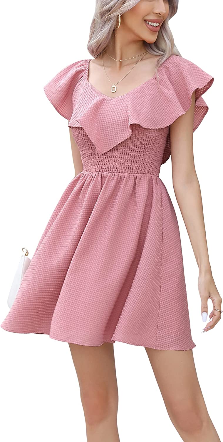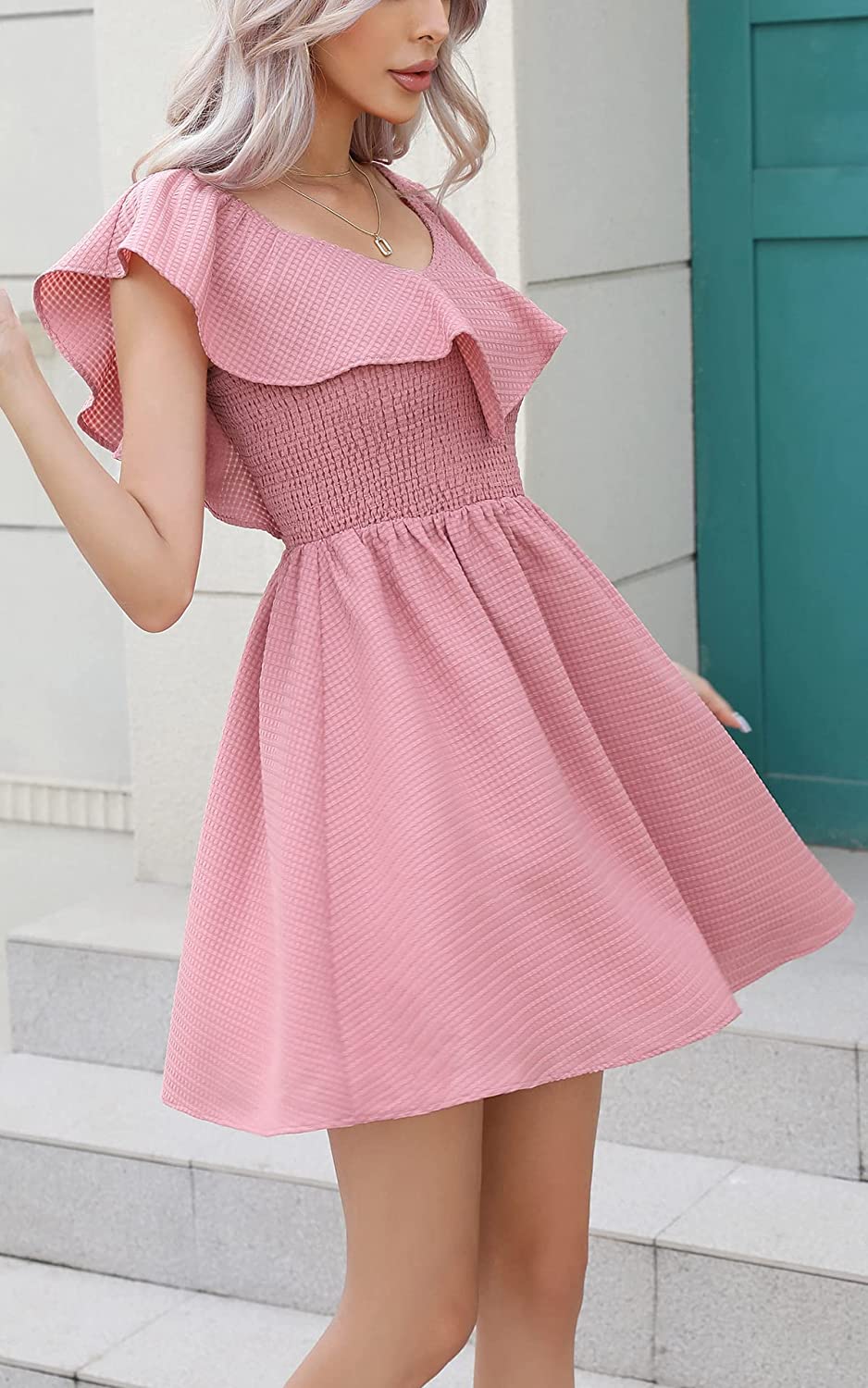 • ?Design: v neck, off the shoulder, short ruffle sleeve, shirred bodice, flowy swing dress, open back, tie back, lining, waffle knit, mini dress