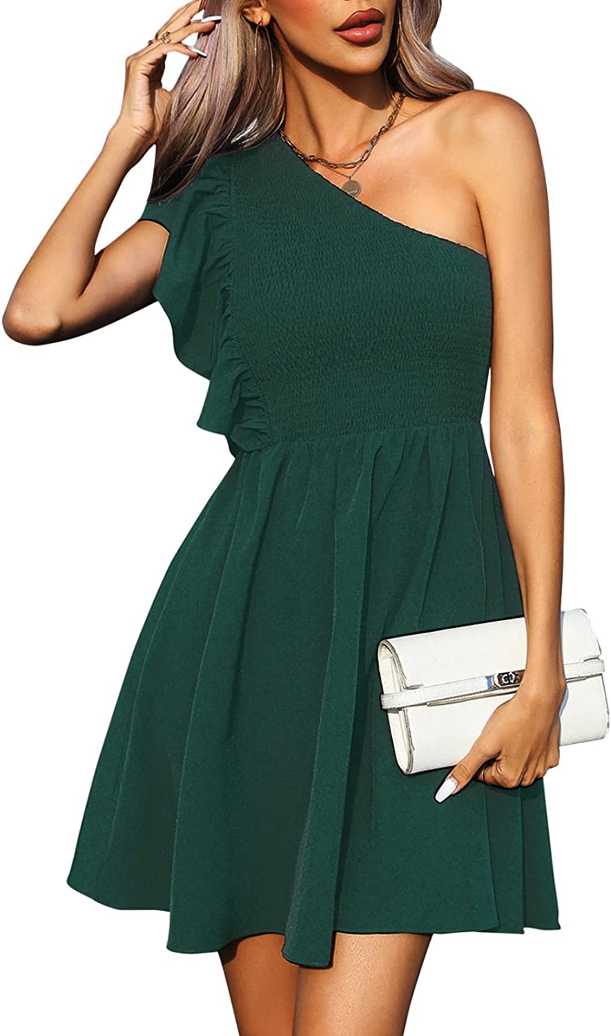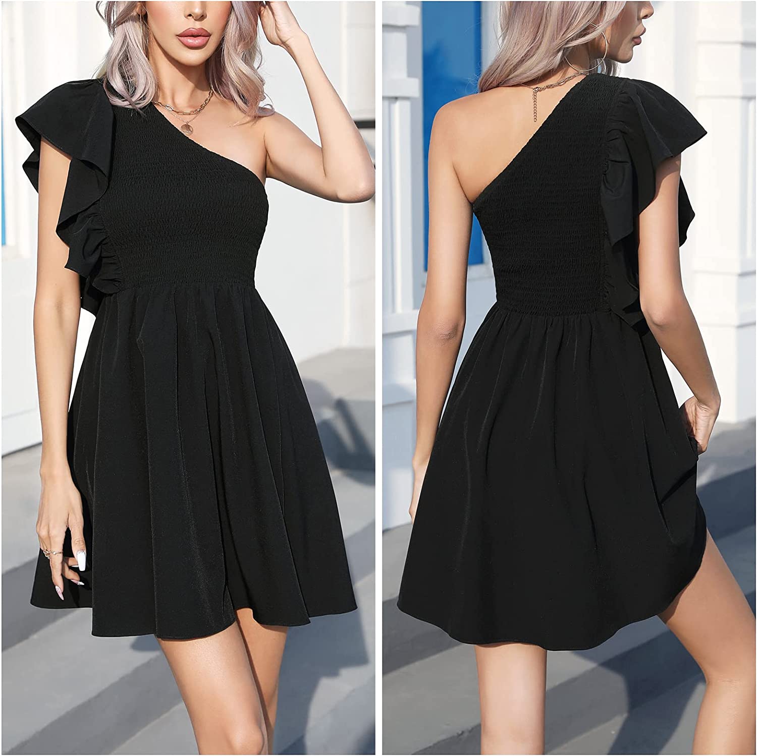 • Features: one shoulder, sleeveless, ruffle sleeve, smocked stretchy bodice, high waist, skater dress, lining, solid color, fit and flare mini dress.