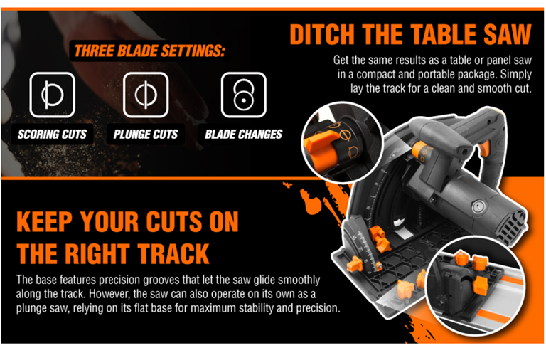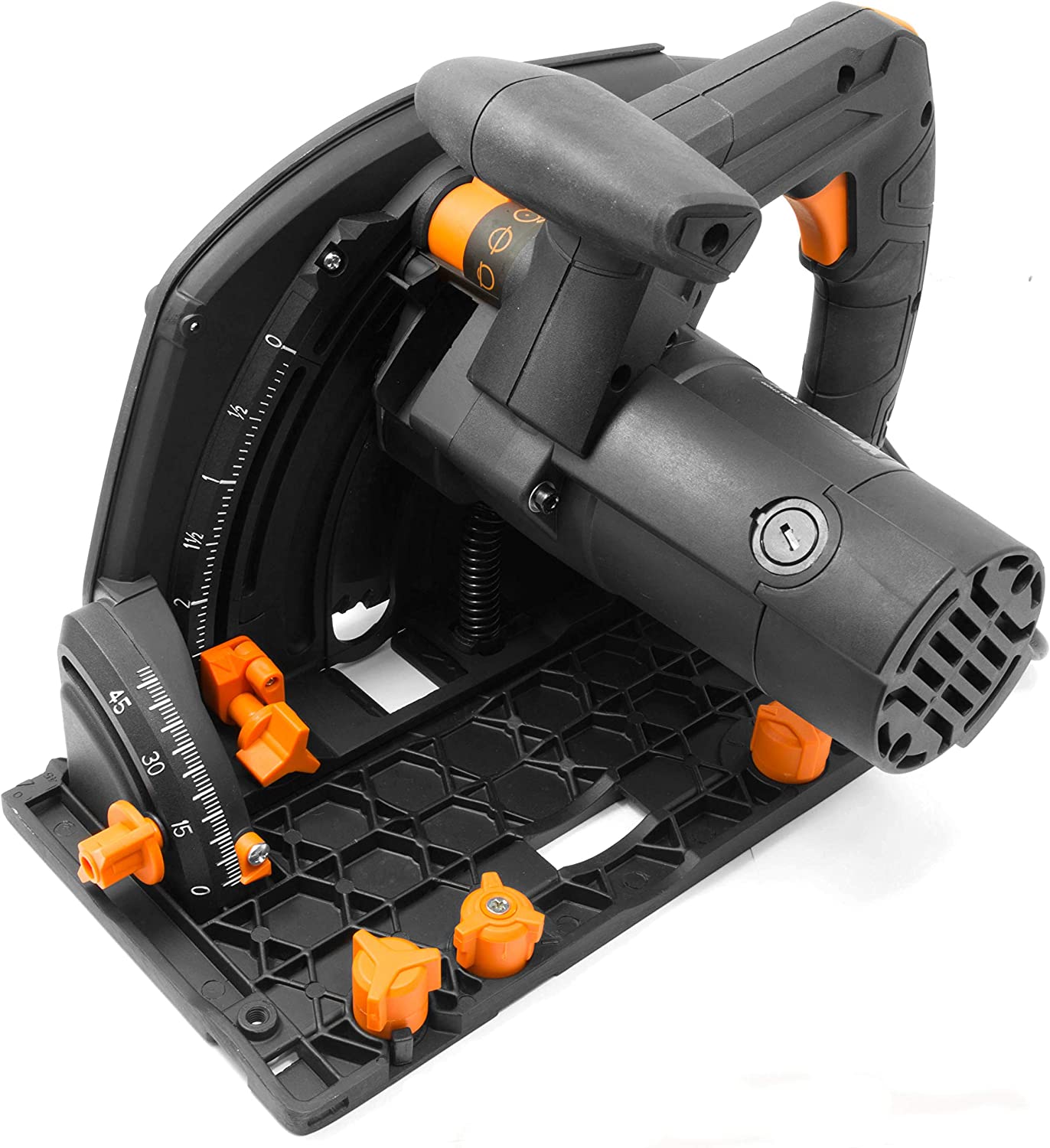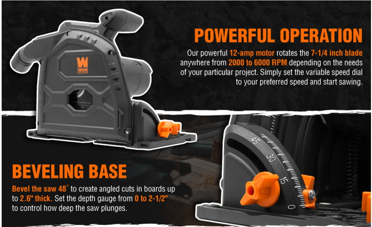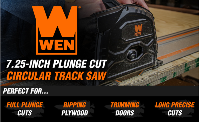 Remember when your saw stayed on the right track? Keep your cuts on the straight and narrow with the WEN 12-Amp Sidewinder Plunge Cut Track Saw. The WEN Track Saw provides users the same results as a table or panel saw in a compact and portable package. Simply lay the track (not included - model CT9502) along the desired surface for a clean and smooth cut. The WEN Track Saw is the perfect companion for ripping plywood, trimming doors, building furniture, and any other application needing long, precise cuts. Our powerful 12-amp motor rotates the 7-1/4 inch blade anywhere from 2000 to 6000 RPM depending on the needs of your particular project. Simply set the variable speed dial to your preferred speed and start sawing. The universal design accepts blades with 5/8-inch arbors, allowing for compatibility with the majority of standard 7-1/4-inch miter and circular saw blades available on the market. Bevel the blade from 0 to 45 degrees to create cuts in boards up to 2.6 inches thick (1.85 inches thick at 45 degrees). Set the depth gauge stop to control how deep the saw plunges. The base features precision grooves that let the saw glide smoothly along the track. However, the saw can also operate on its own as a plunge saw, relying on its flat base for maximum stability and precision. The onboard dust port swivels a full 360 degrees to meet the needs of any project. Simply attach your dust collection device of choice and start sawing. Compatible with the WEN CT9502 100-Inch Track and the WEN CT992F Track Saw Clamps (not included). And, because its a WEN product, your WEN 12-Amp Plunge Cut Circular Saw comes backed by a two-year warranty, a nationwide network of skilled service technicians, and a friendly customer helpline, all to make sure you remember WEN.