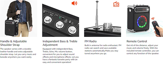 - Colorful Disco Lights: This PA speaker system is equipped with colorful disco lights. Independent button to switch lights. The colorful LED lights create pleasant and romantic karaoke and party vibe for you.With this karaoke machine,you can enjoy a colorful and cheerful party.