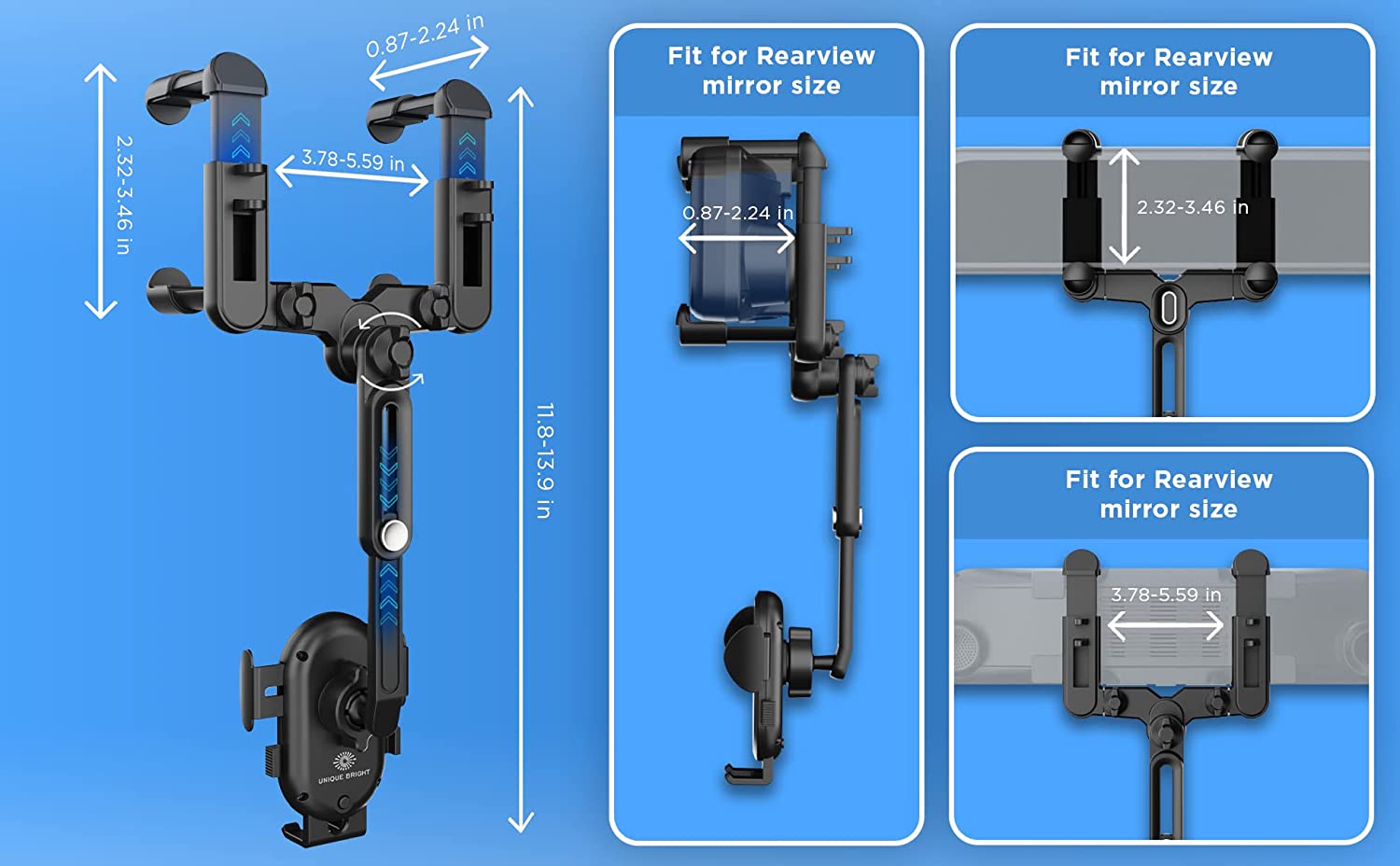 【Rotatable & Retractable Design】The rear view mirror phone mount features telescopic & rotary design. The telescopic arm which extends from 5.1-7.3 inches, allowing for more maneuverability than traditional fixed mounts. Once attached,To adjust the telescoping arm to fine-tune your viewing angle.