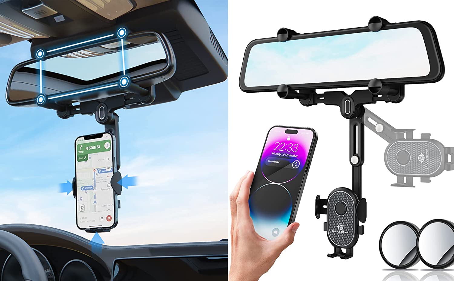 【Free Adjustment Angle】Rear View Mirror clamp designed with a 180° Half Spherical Swivel and Phone Holder with a 360° Adjustment Rod. Support most of your phones either vertically or horizontally over even the roughest terrain. Do Not Like the old style vent-mounted phone holder only be used on a traditional style horizontal air vent and can't be used on vertical or round vents.