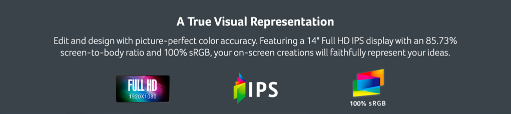 • A True Visual Representation: Create your best content on the 14" Full HD (1920 x 1080) IPS Widescreen LED-backlit 100% sRGB display with 300 nits brightness and 16:9 aspect ratio
