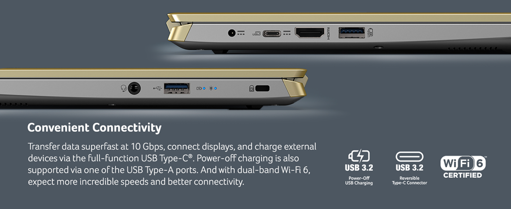 • Ports For All Your Accessories: USB Type-C Port USB 3.2 Gen 2 (up to 10 Gbps) DisplayPort over USB Type-C & USB Charging, 2 USB 3.2 Gen 1 (1 Power-off Charging), HDMI 2.0 with HDCP support, Headphone/Microphone-in Jack, DC-in for AC adapter