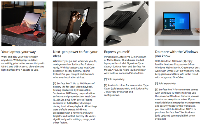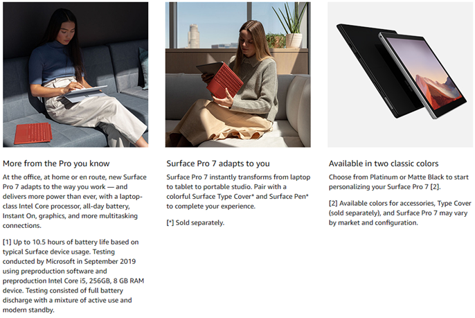 At the office, at home or en route, New Surface Pro 7 adapts to the way you work with laptop-to-tablet versatility. And now, it delivers more power than ever, with a laptop-class Intel Core processor, all-day battery, Instant On, improved graphics, and standby time — plus more multitasking connections, including both USB-C and USB-A ports.