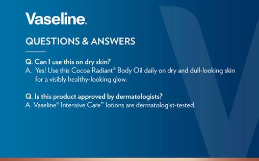 Vaseline Intensive Care Cocoa Radiant® Body Oil, with 100% Pure Cocoa Butter and Replenishing Oils, for the ultimate skin care experience. This body oil moisturizes dry and dull-looking skin for visibly healthy-looking, glowing skin. Our vitalizing skin moisturizer formula, infused with 100% Pure Cocoa Butter and Replenishing Oils, locks in moisture to promote a smooth, natural glow. With a soft, cocoa fragrance, this body oil is the ideal moisturizer for relieving everyday dryness, as well as soothing irritation. Smooth, hydrated skin can be yours with Vaseline Intensive Care Cocoa Radiant Body Oil. Vaseline’s moisturizing lotion goes beyond basic moisturization. Our Intensive Care range works to heal dry skin from deep within. The formula used in this body moisturizer for dry skin restores the essential moisture your skin needs, while also delivering a blend of nourishing ingredients. Vaseline assists the skin’s natural recovery to help dry skin heal by locking in moisture. Explore the range of Vaseline products, including Vaseline lotion, and enjoy the healing power of Vaseline. Skin health is essential for well-being. We’re helping those underserved get better care for their skin.