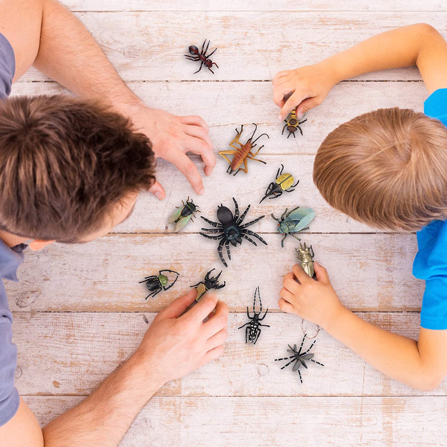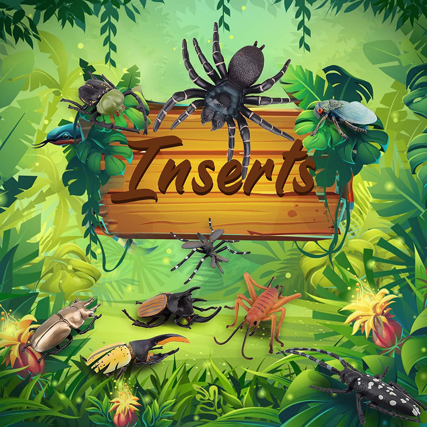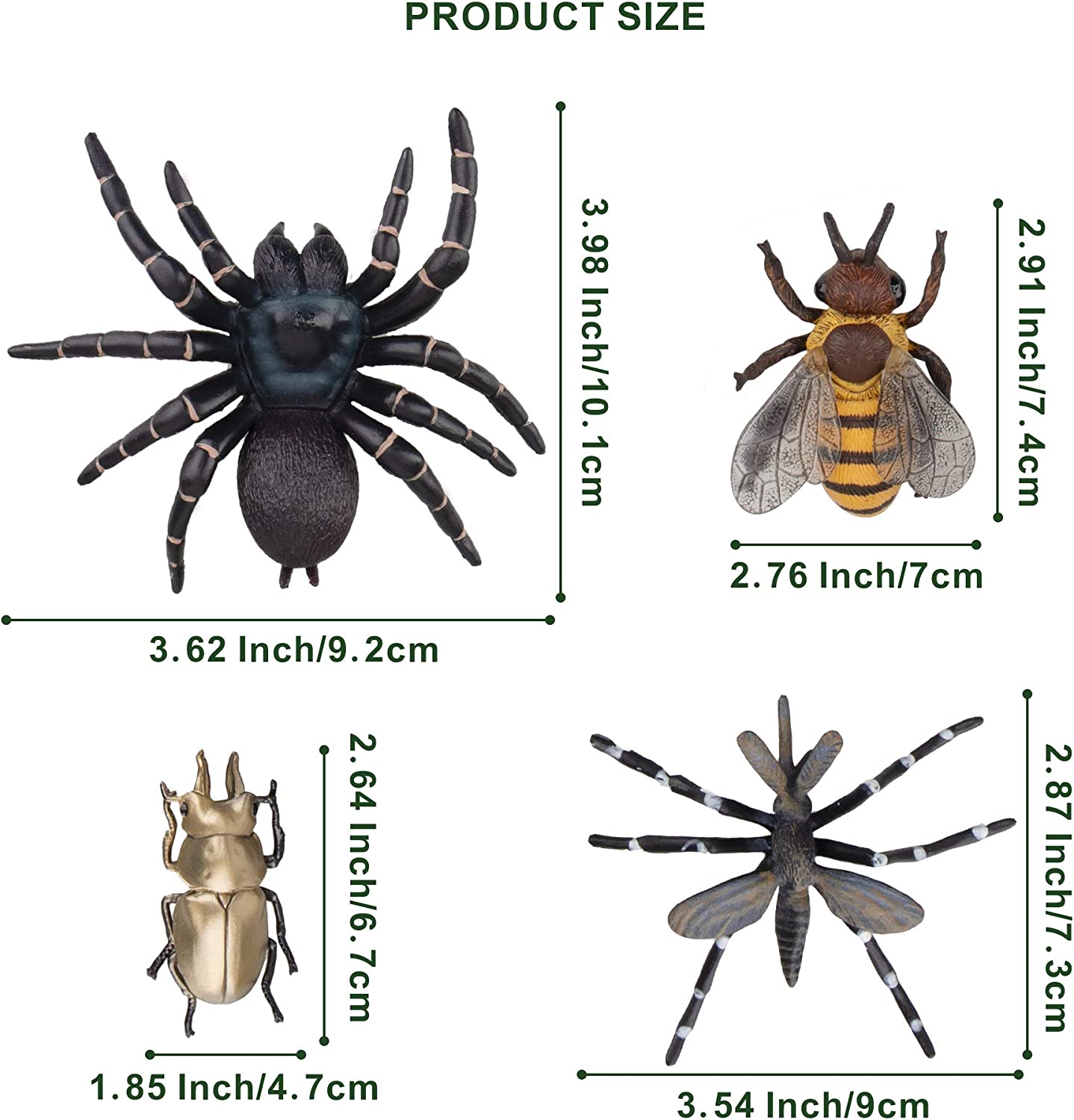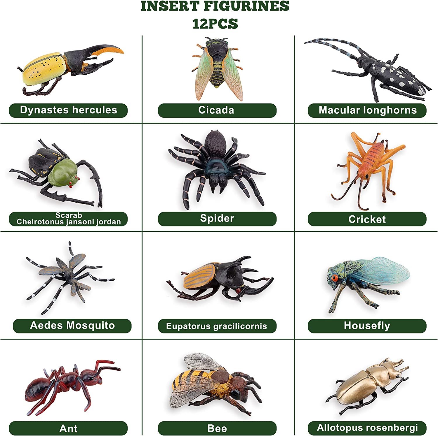 • ✔ 12PCS HIGH QUALITY INSECTS FIGURINES - Includes 1 Dynastes Hercules, 1 Cicada, 1 Macular Longhorns, 1 Scarab Cheirotonus Jansoni Jordan, 1 Spider, 1 Cricket, 1 Aedes Mosquito, 1 Eupatorus Gracilicornis, 1 Housefly, 1 Ant, 1 Bee, 1 Allotopus Rosenbergi. Totally includes 12 bugs figurines.