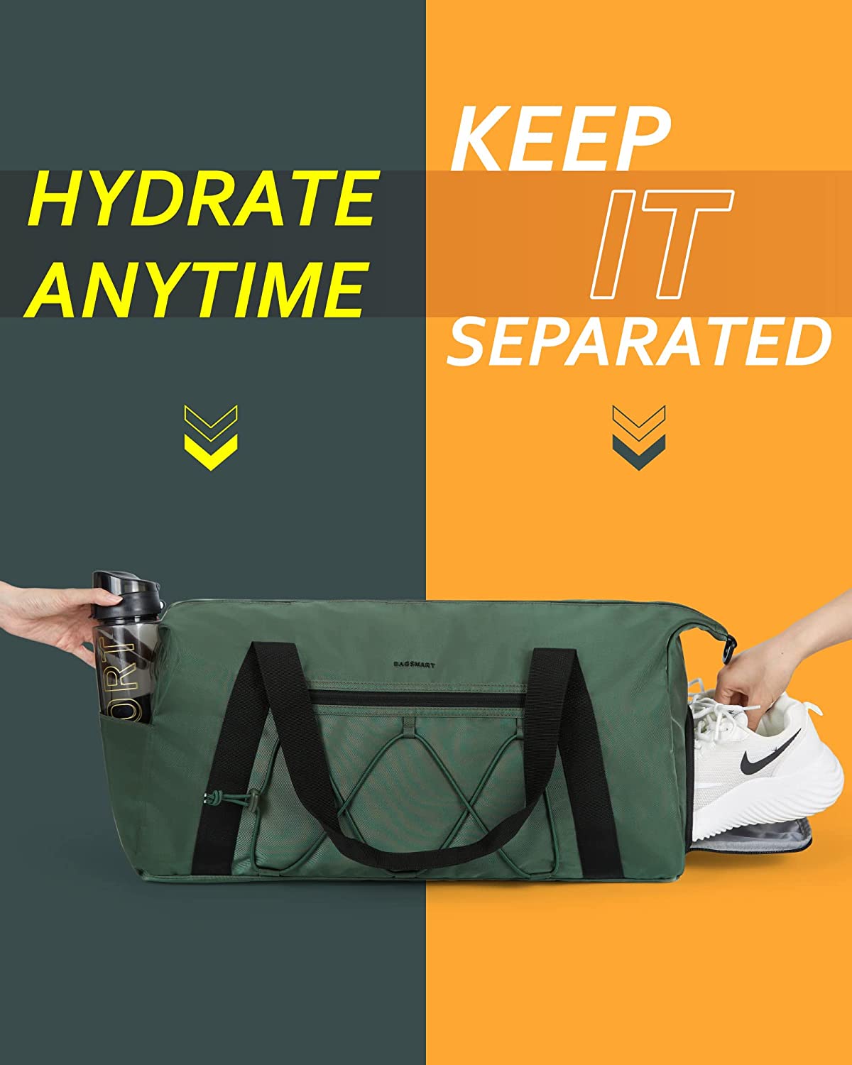 • OUT-OF-SIGHT STORAGE: Sizes 22(L) x 7.1(W) x 11(H) inch. The BAGSMART Workout Bag is ideal for everyday use before and after training. The wide bottoms give you plenty of space for your things. The waterproof fabric inner pocket separates dirty and wet clothes(or toiletries) from other items for wet and dry storage.