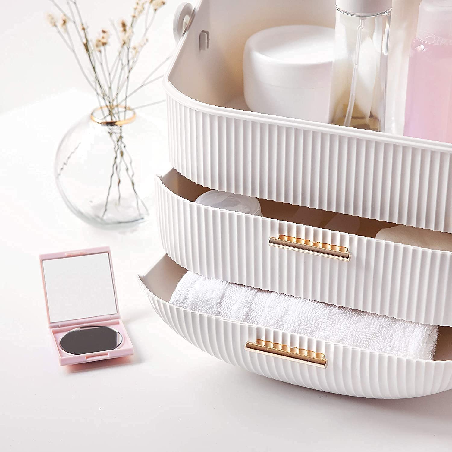 【Stunning & Awarded Design】With a stunning curved design(golden plated supporting legs and drawer handles, this makeup organizer is also a charming ornament for any countertop, vanity or dresser.