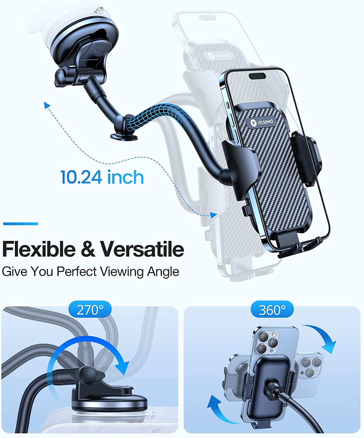 VICSEED Universal Phone Mount for Car [Strong Suction] [Flexible Durable Long Arm] Gooseneck Car Phone Holder Mount Windshield Dashboard 360 Rotation Cell Phone Holder Car for All Mobiles & Cases
