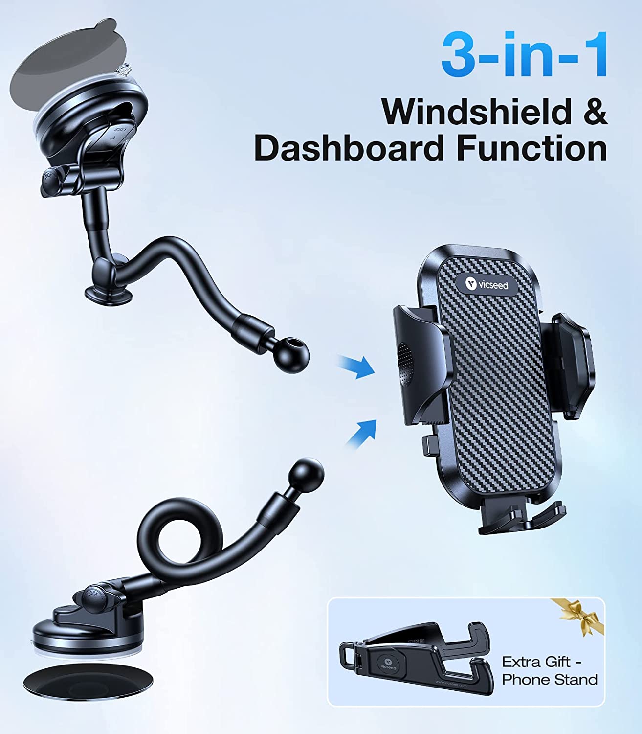 • ?[Strongest Suction, Ensure 300% Stability]①The strongest suction cup of VICSEED car phone mount is made with 3 layers of macromolecule nano-gel, which can provide superior suction power up to 77 LB②The gift 3M adhesive pad offers flat and smooth surface to increase 200% stability and durability③The extra Anti-shake stabilizer make the whole car mount super stable. So this car holder for cell phone can still hold your phone 300% stability without shaking, even on bumpy road or emergency brake!