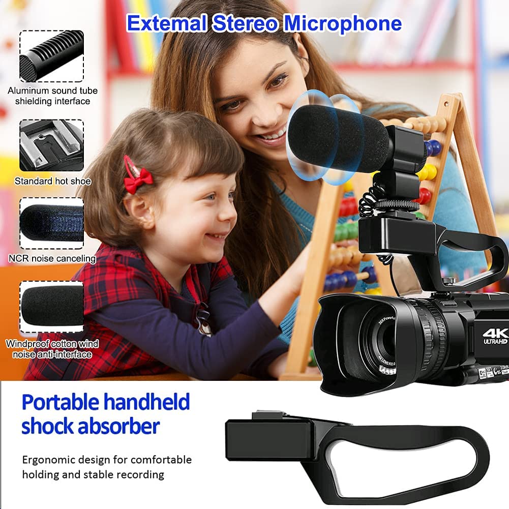 - 4K Multifunctional Camcorder with Handheld Stabilizer:The 4K HD camcorder has 60PFS (3840*2160)video resolution ,48.0 mega pixels,3.0 inch touch screen, 30X digital zoom, loop recording, face detection, self-timer, supports up 128GB SD card and standard tripod(not include). Portable Handheld Stabilizer can Keep the camcorder stable when recording, suitable for low-angle shooting.