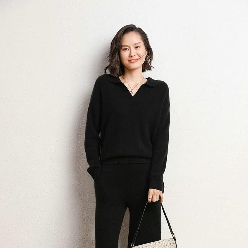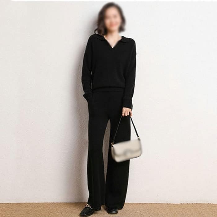 Walnut Cashmere Sweater Women Polo V Neck Set Knitting Loose Casual Wide Leg Pants Thickened Sweater Two-Piece Set (Color : D, Size : L Code)