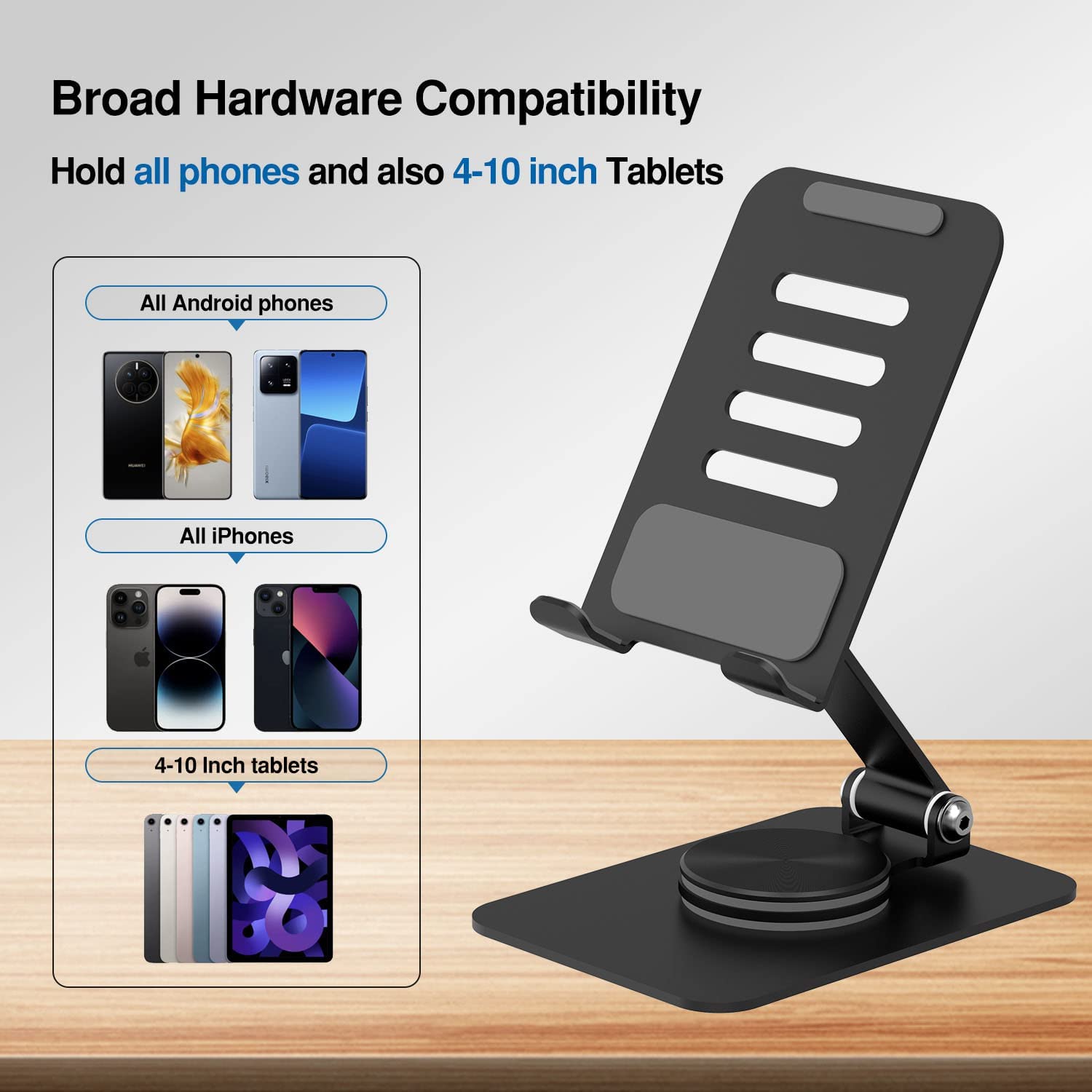 • [Easy to Charge and Carry]: This mobile phone stand is designed with a charging cut-out on the bottom which can be used to work while charging. This 360 rotating phone stand folds easily to a nice compact size for storage or transport