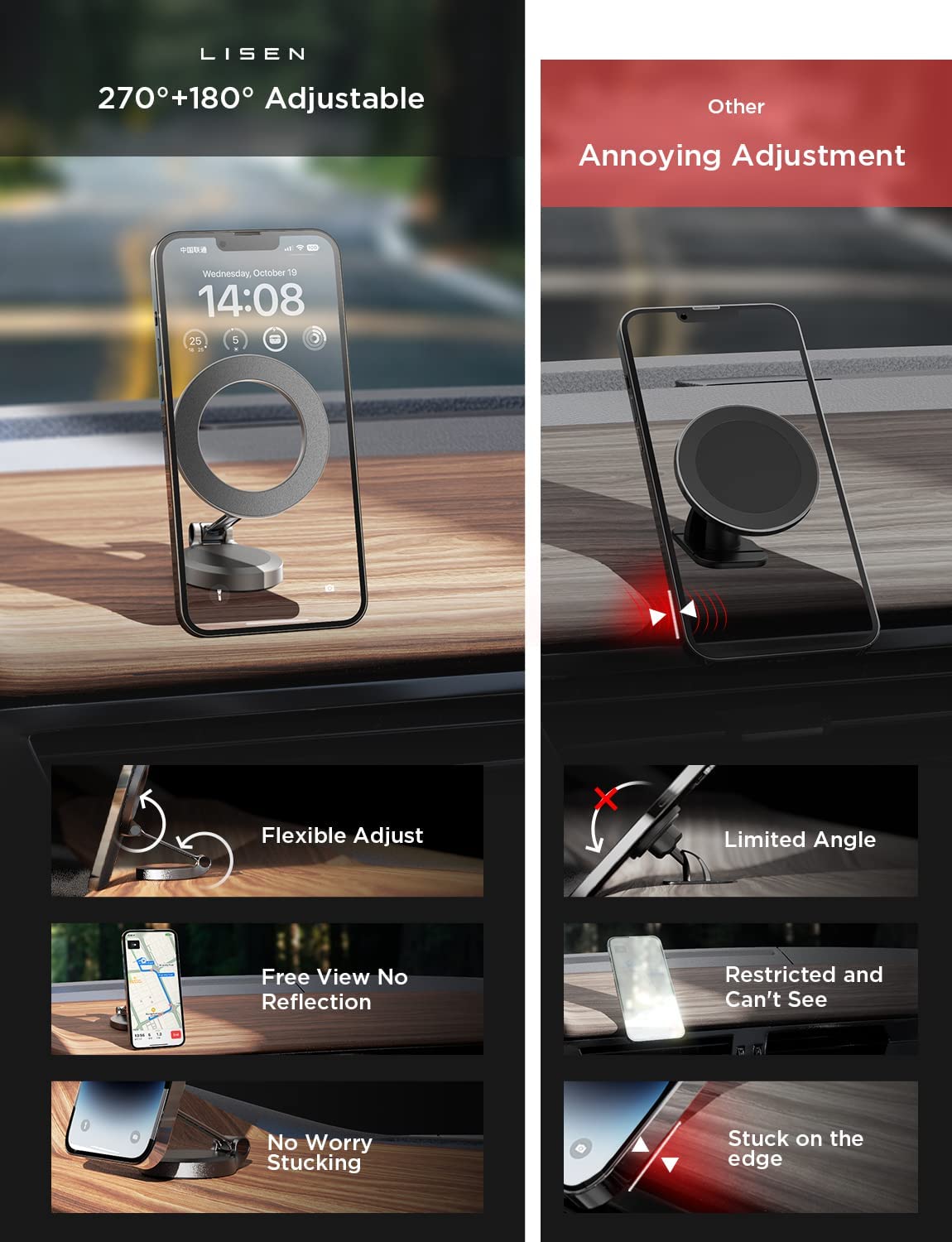• ?MORE STABLE, MORE DURABLE?: LISEN has upgraded this magsafe car dash mount from 3 directions; ①Upgrade Multi-adjustment to help you find the best car mount location; ②Cell phone holder for car mount with most durable all zinc alloy design; ③Magnetic phone car mount that has the strongest magnet force, which can hold up to 12 iPhone 14 Pro Max. LISEN provides at least 1 years of user service.