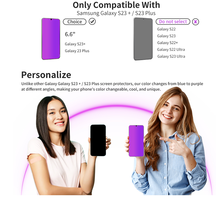 【Personalize】Unlike other Galaxy S23+ screen protectors, our color changes from blue to purple at different angles, making your phone's color changeable, cool, and unique.