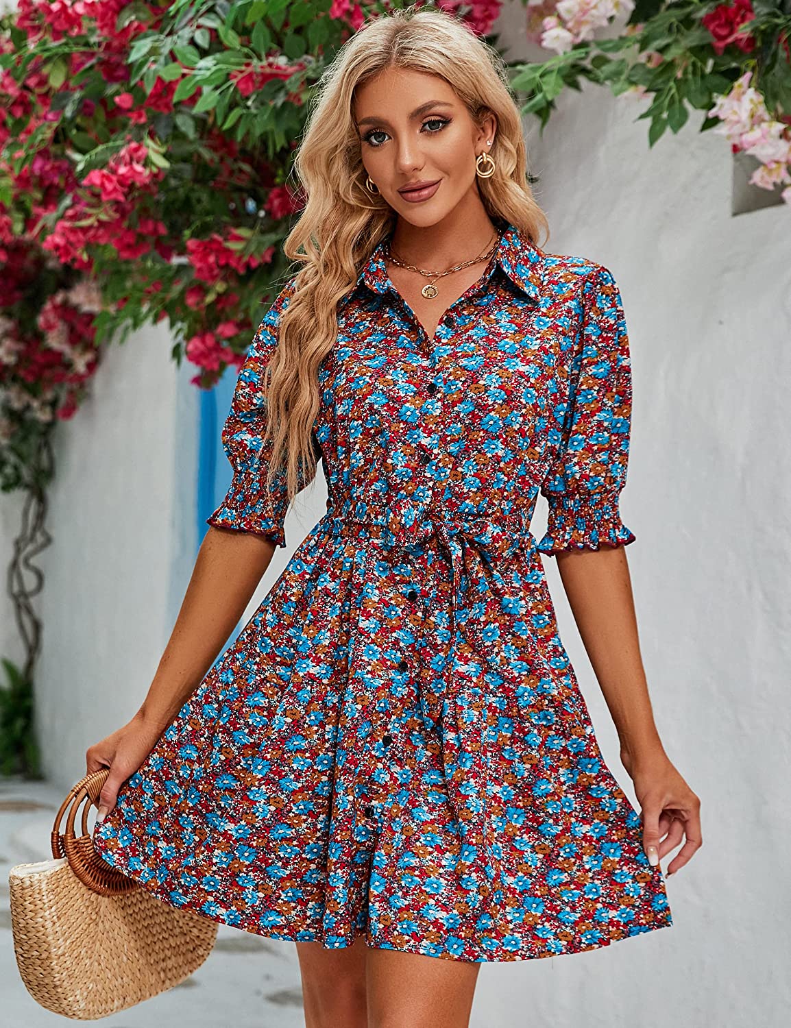 Feature: Womens summer dresses feature square neck, puff short sleeve with elastic cuffs which also can be sexy off shoulder, stretchy smocked bust design, elastic empire waist with cute ruffle, tie open back, 2 pockets, floral print, above knee length, a line baby doll silhouette, releaxed fit.