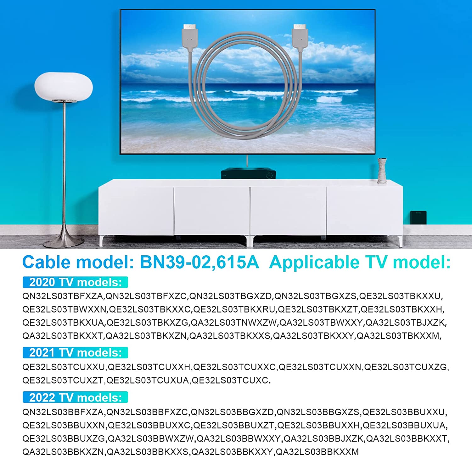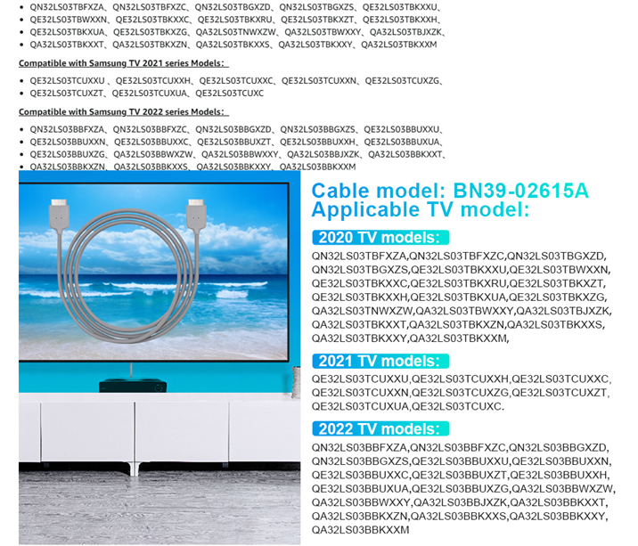 • Compatible with Samsung TV 2020 series Models:QN32LS03TBFXZA、QN32LS03TBFXZC、QN32LS03TBGXZD、QN32LS03TBGXZS、QE32LS03TBKXXU、QE32LS03TBWXXN、QE32LS03TBKXXC、QE32LS03TBKXRU、QE32LS03TBKXZT、QE32LS03TBKXXH、QE32LS03TBKXUA、QE32LS03TBKXZG、QA32LS03TNWXZW、QA32LS03TBWXXY、QA32LS03TBJXZK、QA32LS03TBKXXT、QA32LS03TBKXZN、QA32LS03TBKXXS、QA32LS03TBKXXY、QA32LS03TBKXXM.