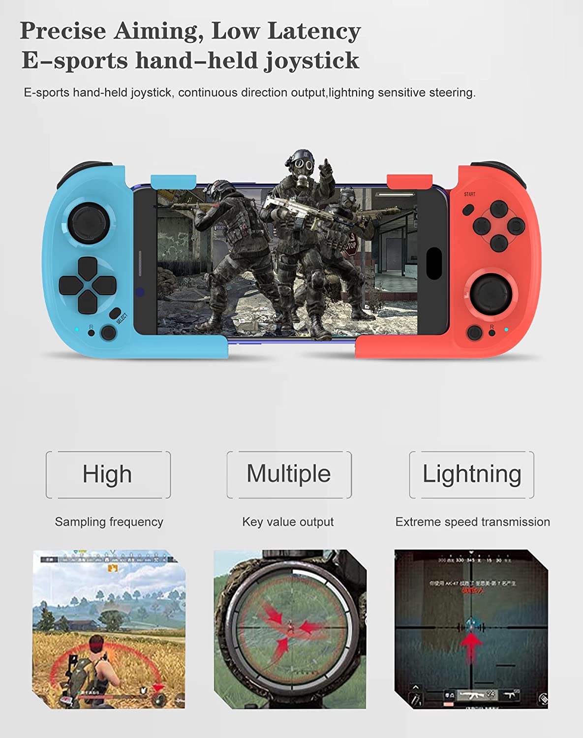 • ?【Support One-Handed Operation】The gaming controller can be split into two separate left/right controllers, ergonomically designed for easy grip and operate smartphones in One hand.