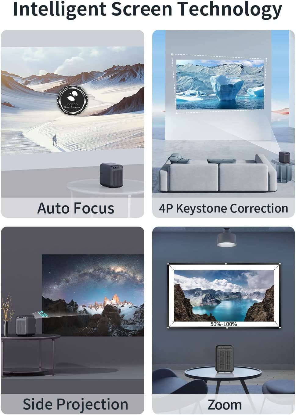 - Auto Focus Projector& 4P Keystone Correction& Zoom Function : WANBO Portable Projector is Self-developed AI focus algorithm with 9 directional gyro, finish auto-focus instantly and clear image keeps as it is. With the innovative 4D/4P Keystone correction,It can adjust Horizontal angles ±30° and support side projection, you could watch from almost every angle.With the ZOOM function, it can adjust image size from 50% to 100% display what size you want without moving the projector.