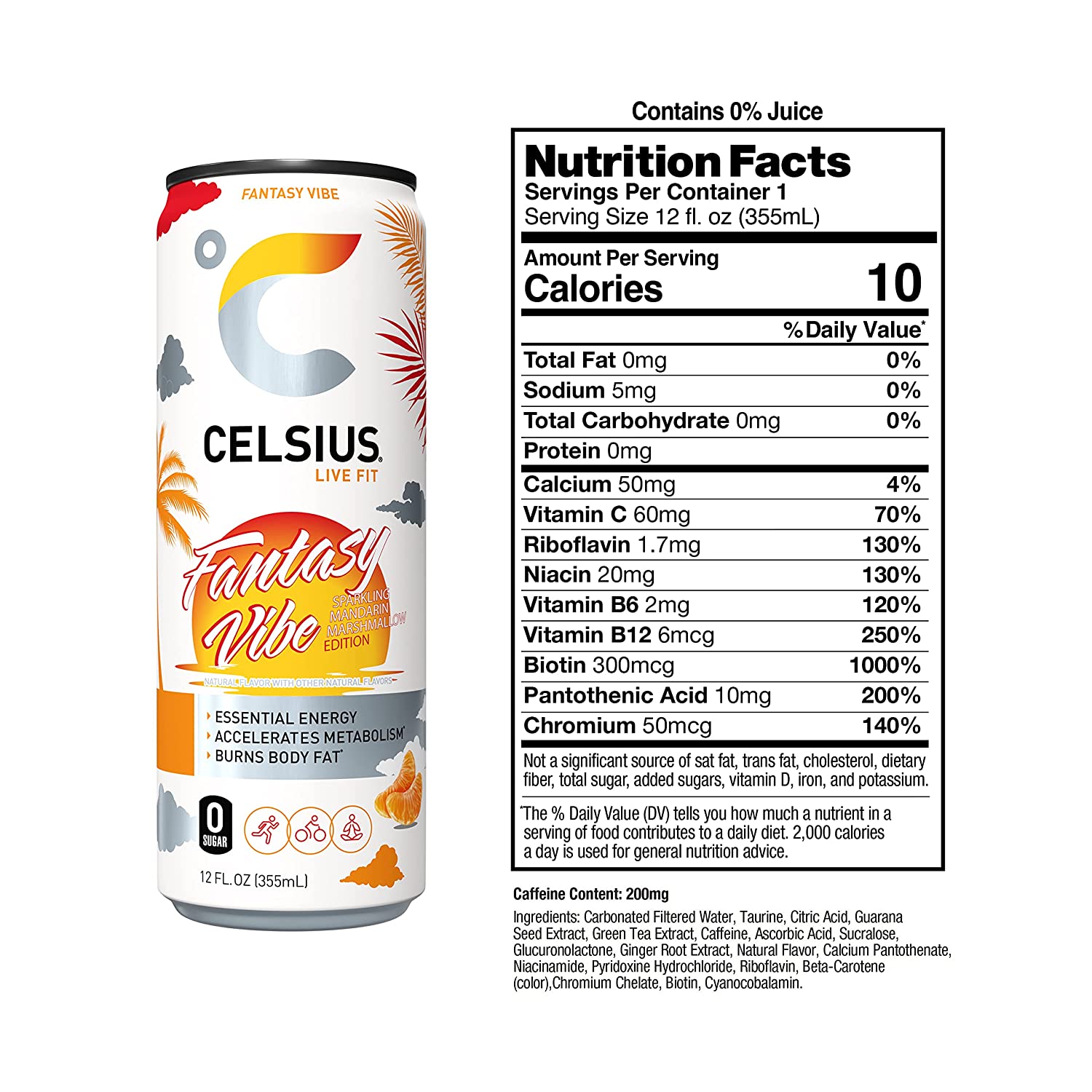 • Bursting with the crisp sweetness of a mandarin and indulgence of a velvety marshmallow, CELSIUS Fantasy Vibe gives you the perfect flavor combination of a fun treat. This sparkling flavor has bright citrusy profile with an end note of creamy marshmallow similar to a Orangesicle taste.