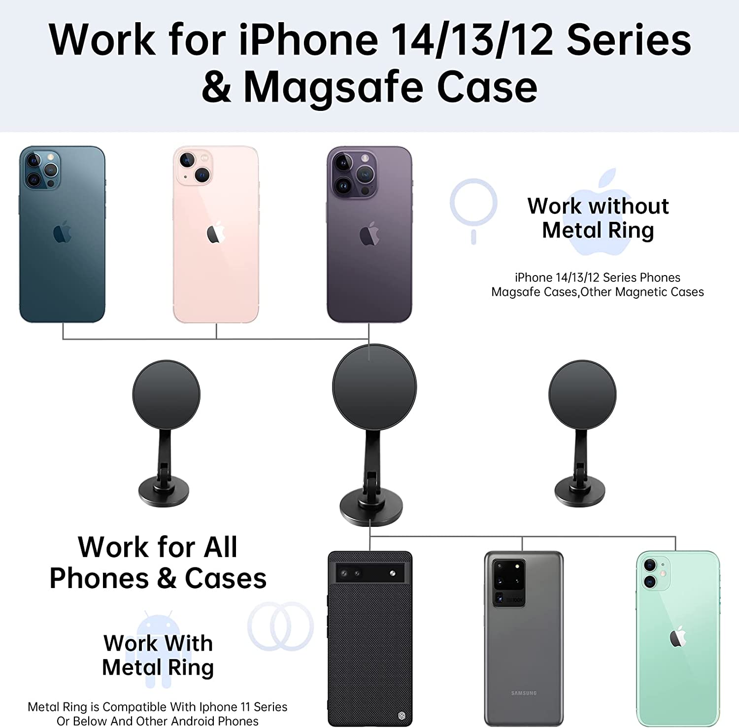 • When you use unofficial magsafe cases or non-iphone 12/13/14 series, or other series of phones or cases must use the metal ring.