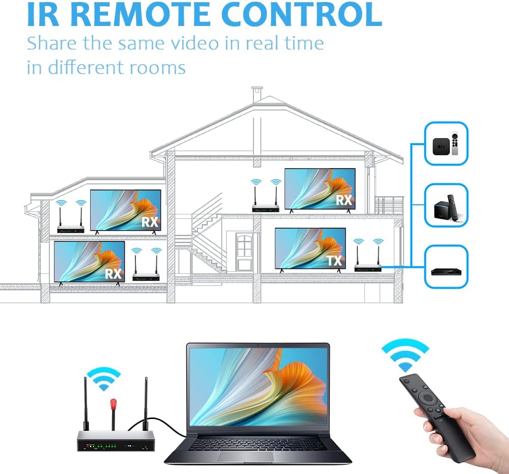 - 【IR Remote Control & KVM】 - This wireless hdmi extender is convinient for easily control the source device on the receiver between different room, different floors with any IR remote control or keyboard/mouse. It is the best choice for home theater, widely used in meeting rooms,Classrooms,Training rooms, living rooms, Roofs, Garages, Etc.