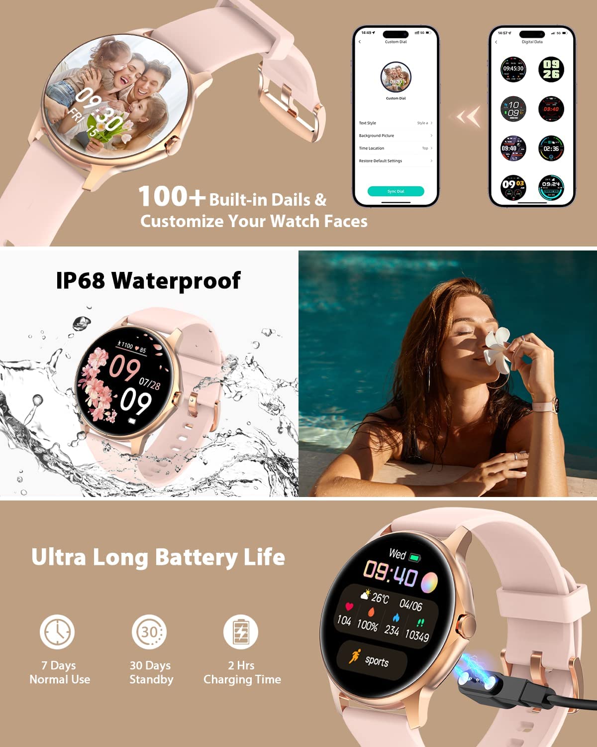 - 【Bluetooth Calling & Smart Notifications】Free up your hands with the smart watch and make calls from your own wrist. With a built-in speaker and microphone, calls become easy to make, whether you're exercising outdoors or tidying up at home. Once connected to your phone, you can make, receive and reject calls and view call logs directly on the smart watch for women. Stay connected to SMS and APP messages(Text, Facebook, WhatsApp, Instagram, Twitter, etc.), never miss any important information.