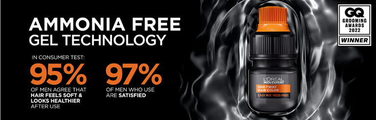 L'Oreal Paris Men Expert One Twist Hair Color will cover your gray hair in just 5 minutes. This permanent hair dye provides undetectable gray coverage that fades naturally in 6 weeks. Easy and mess free application: just twist, shake, crack and apply. The results speak for themselves, 97% of men claimed satisfaction and 9/10 men would recommend to a friend*. L'Oreal has created a collection of 8 natural looking mens hair color shades, varying from dark blonde to jet black. L'Oreal Paris Men Expert offers quality skin & hair care products designed for men, harnessing the power of hard-working ingredients combined with advanced science and expert research.